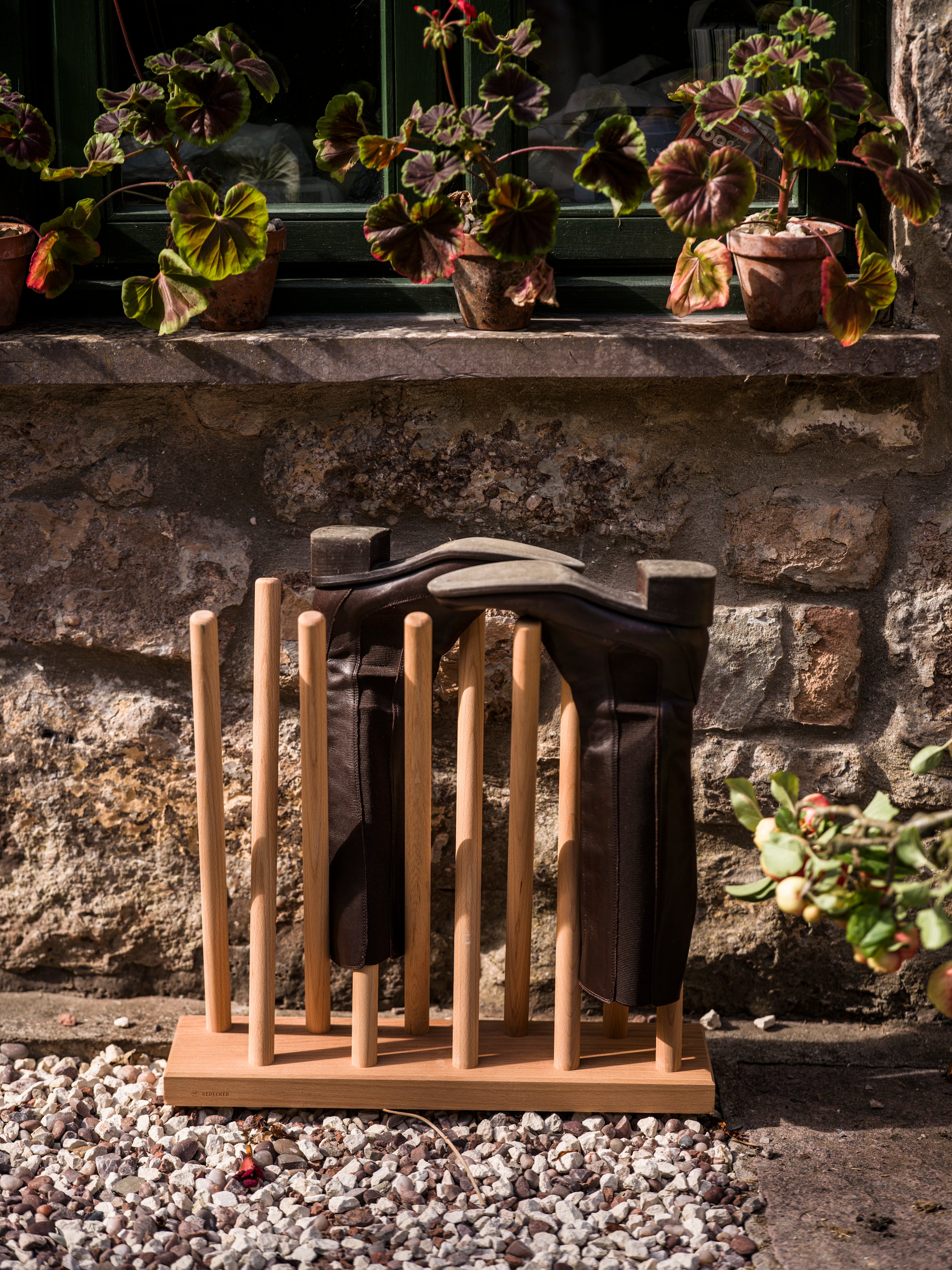 This wooden boot holder efficiently stores up to five pairs of shoes or boots all the while conserving precious space in your entryway.