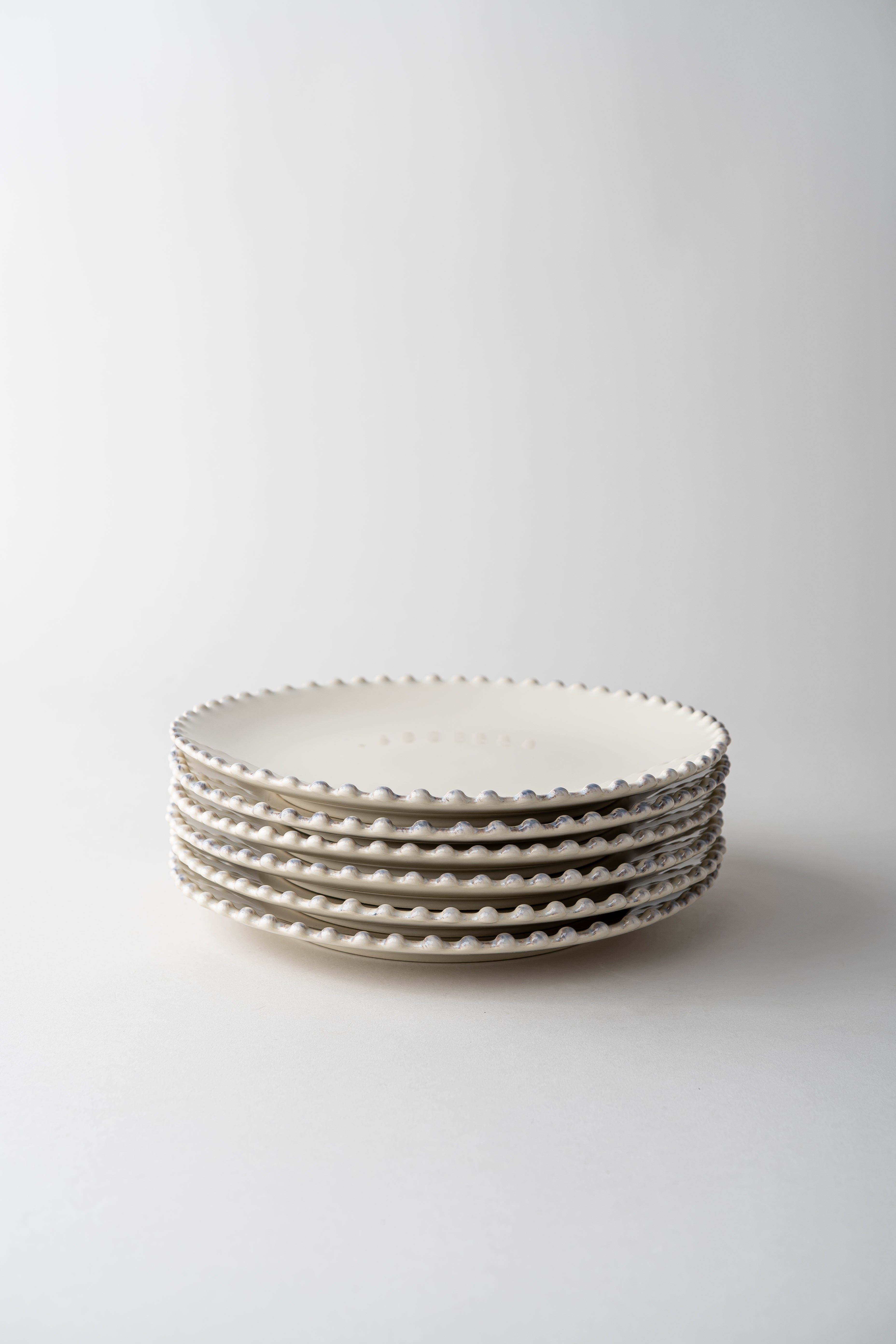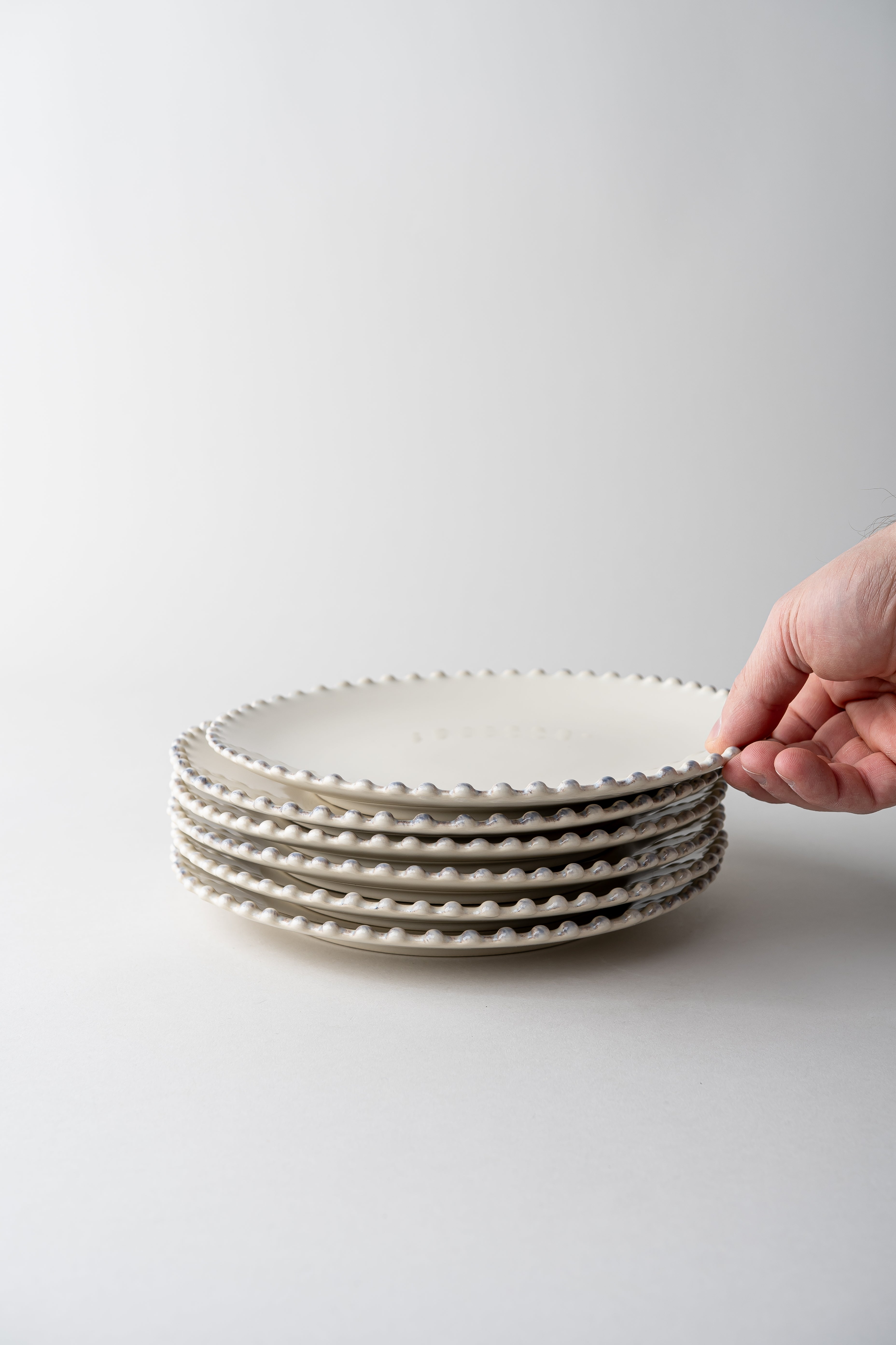 Exuding charm, elegance, and simplicity, the vintage-inspired Pearl dinnerware collection is a nod to classical European ceramics while staying firmly rooted on a contemporary table. Small ceramic drops inspired by freshwater pearls outline the edges of each piece, providing a delicately striking appeal.