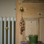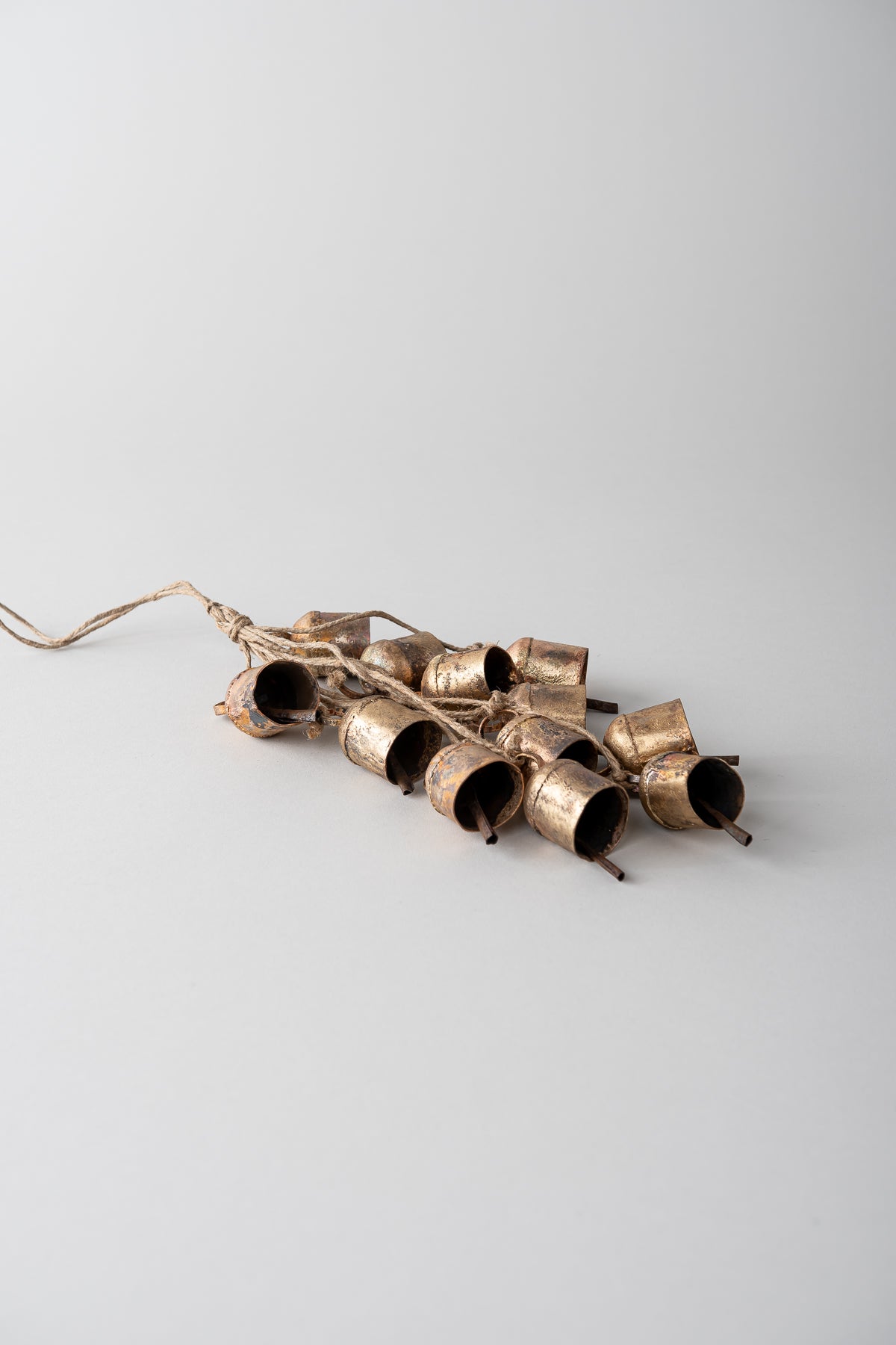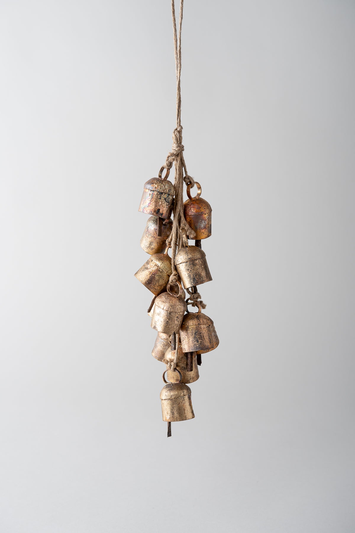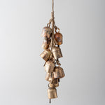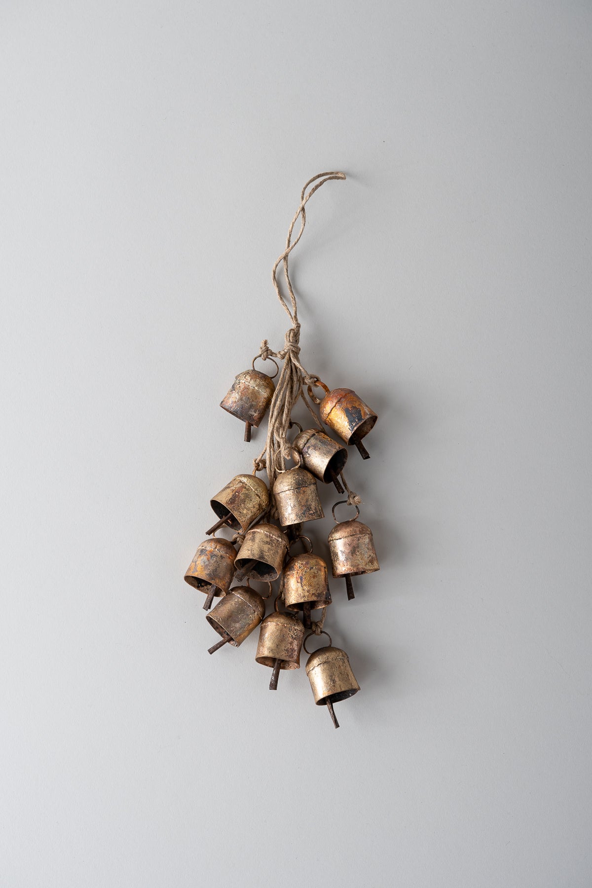 Twelve little Noah bells clustered together on jute for a beautiful display! Gorgeous anytime of year for the fireplace, patio, or coat rack, and especially charming during the holidays for a dash of rustic holiday whimsy.