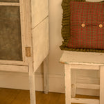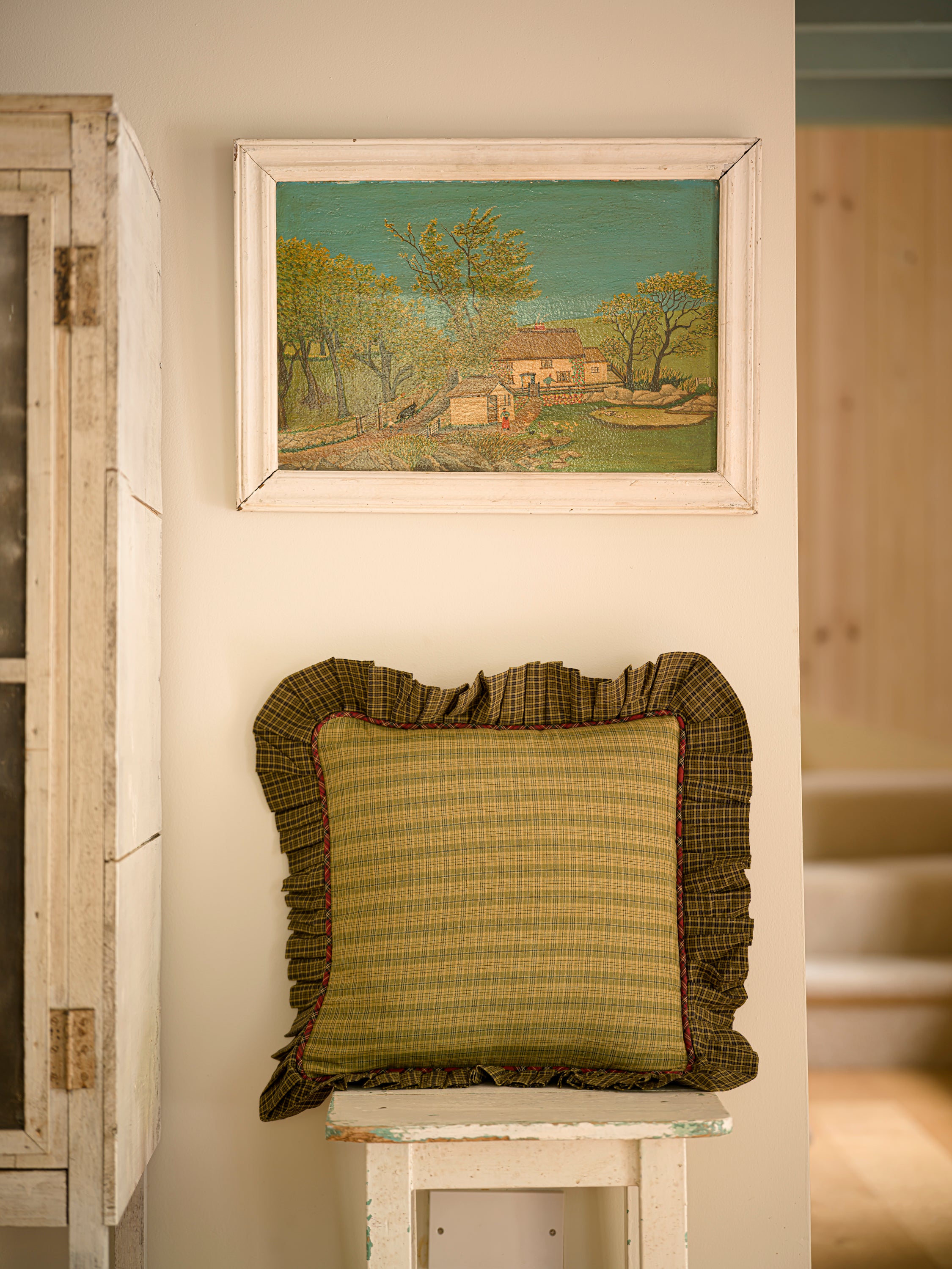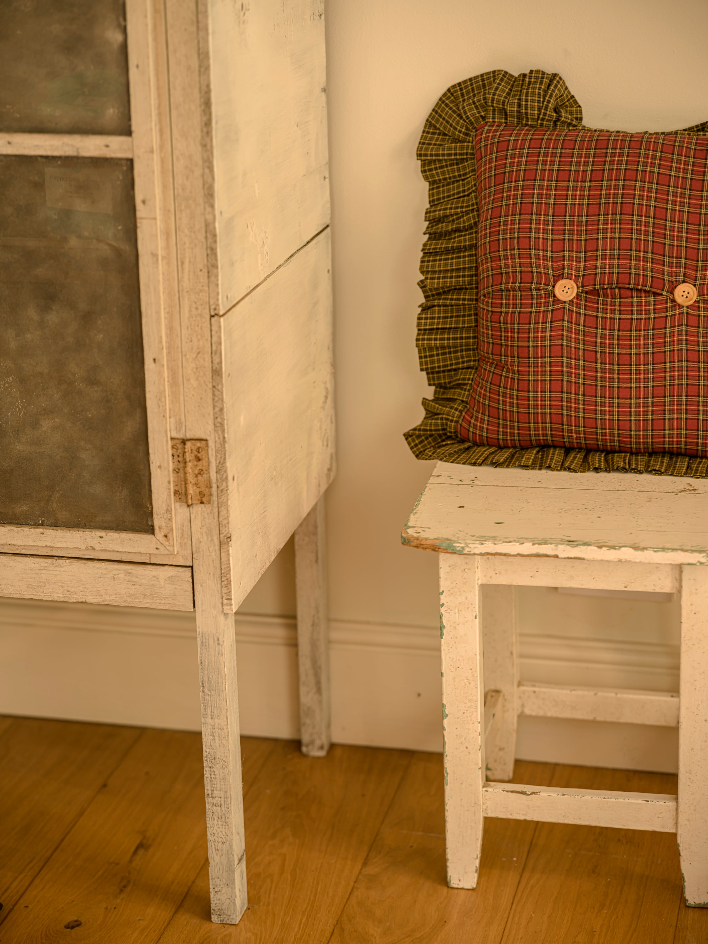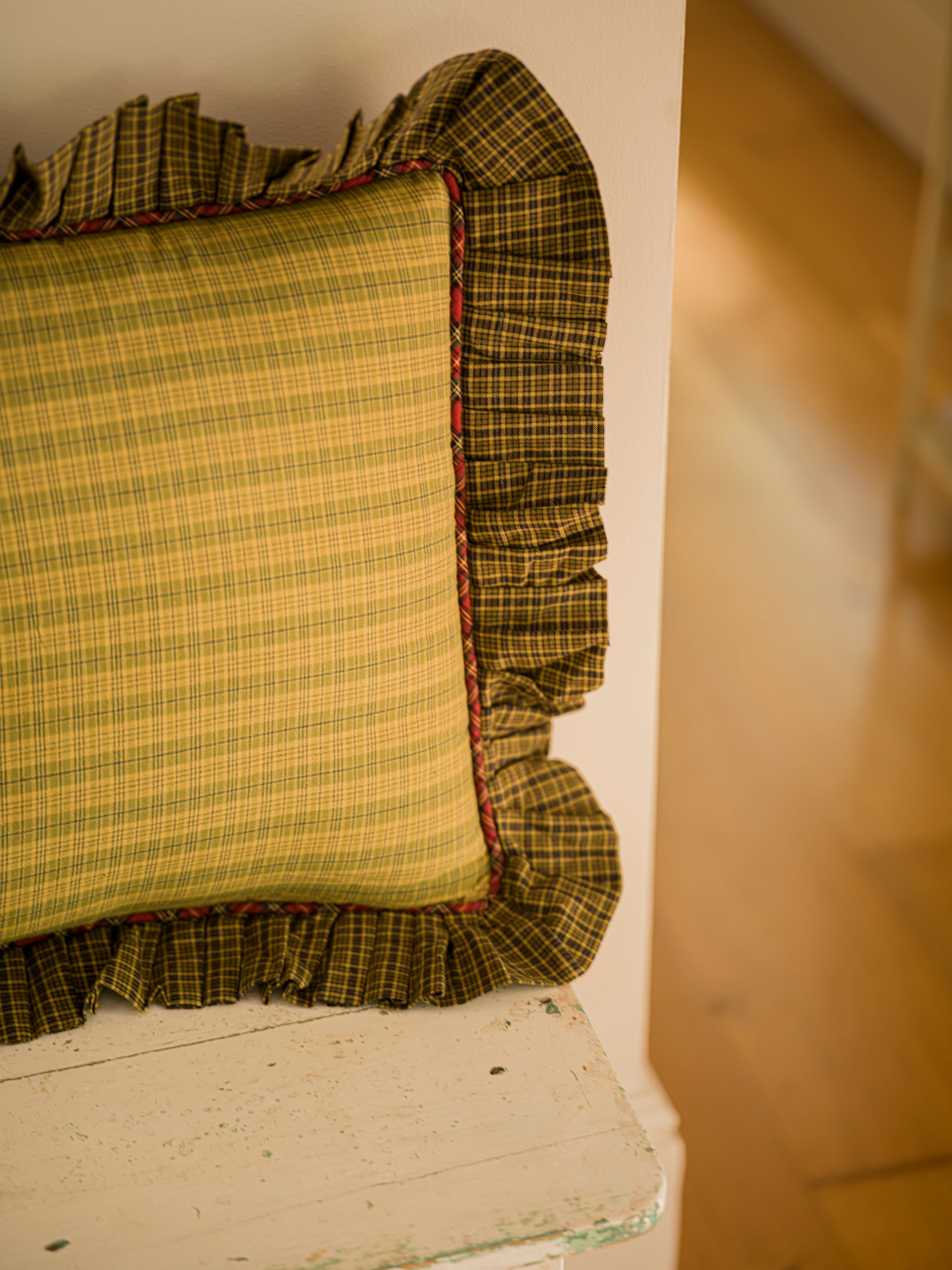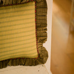 Soft greens and deep reds come together in this ruffled accent pillow, blending rustic charm with considered detailing.