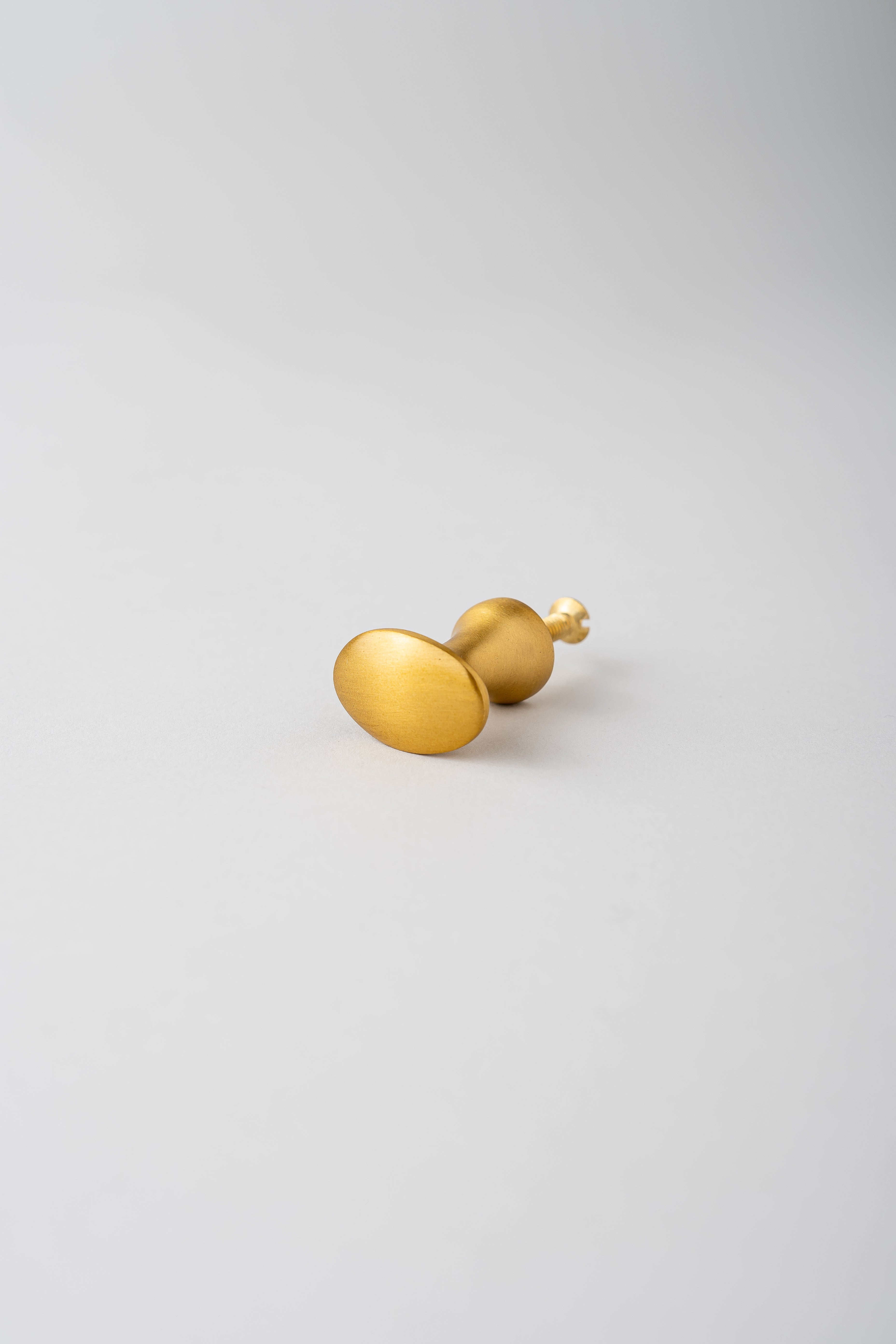 A simple and sleek oval brass knob in warm, antiqued brass. Useful on doors and drawers, for a quick kitchen facelift, or for reimagining your space on a larger scale renovation.
