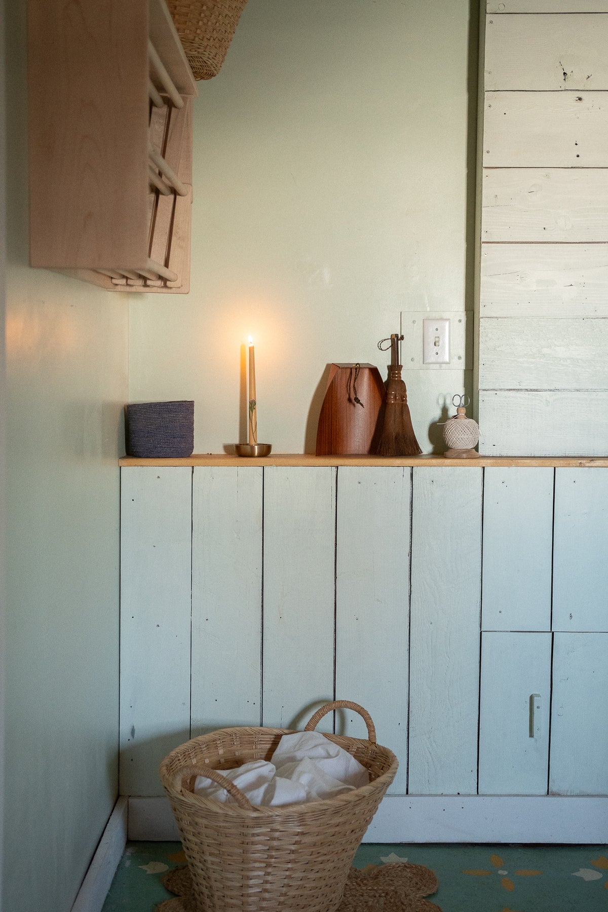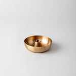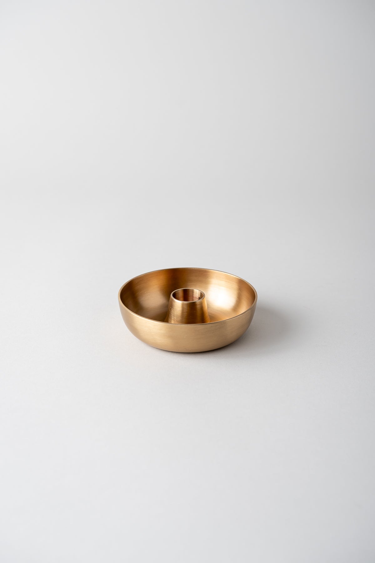 Hand-made of warm antiqued brass, this understated candle holder seamlessly blends into any space.