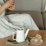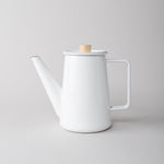 The generously sized enamel steel pot is cleanly embellished by a beautiful maple wood lid knob for finger-friendly refilling.