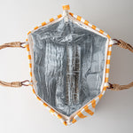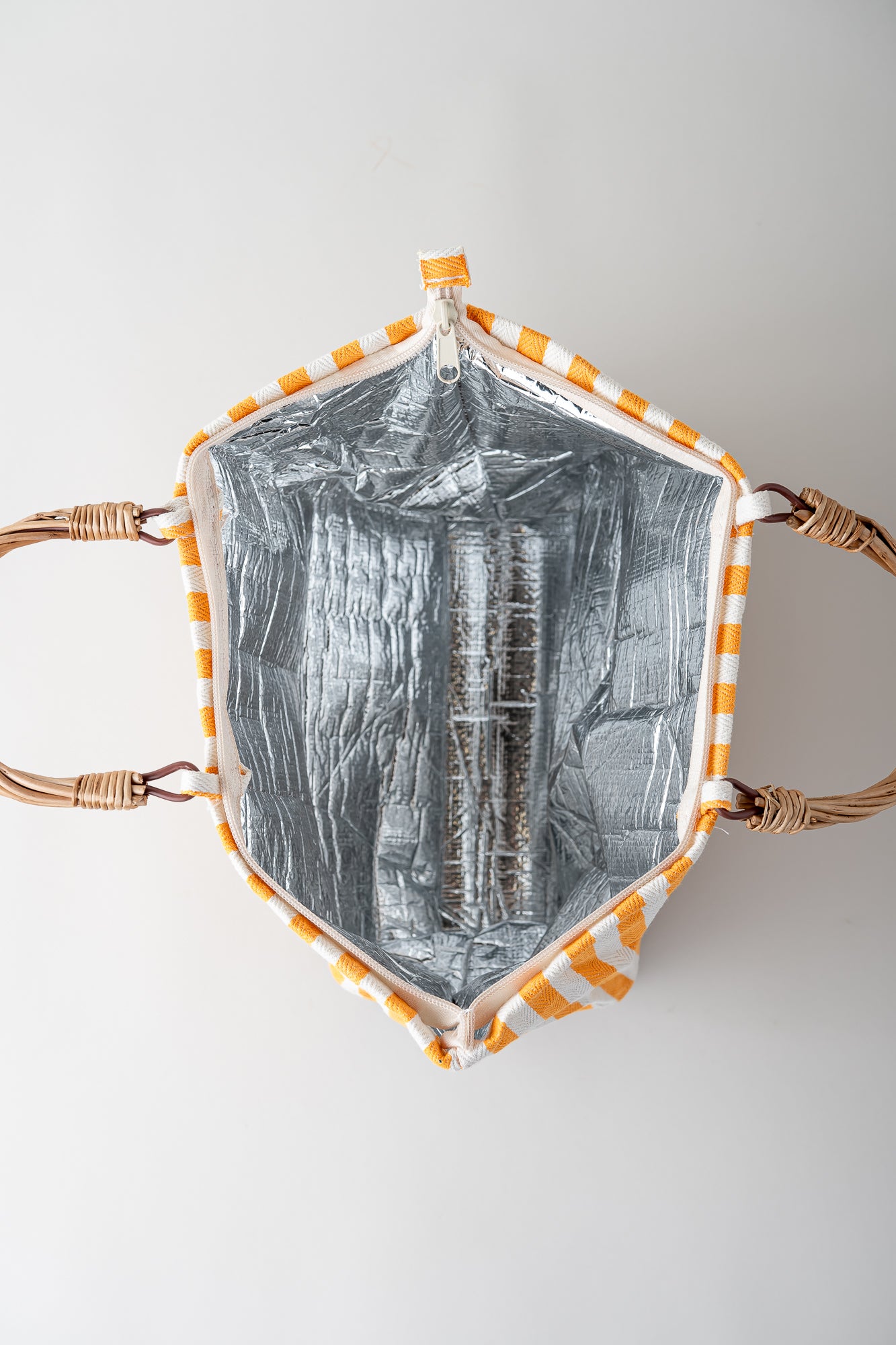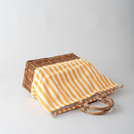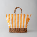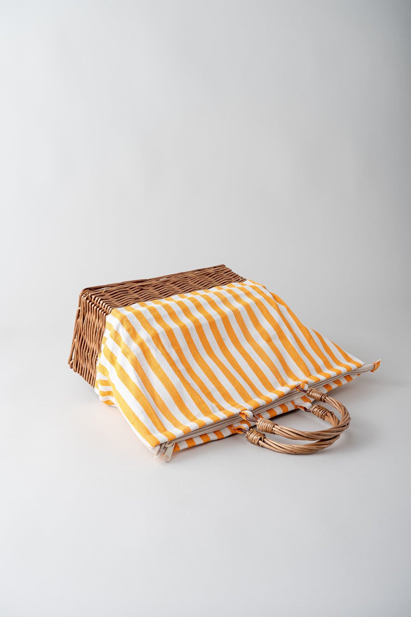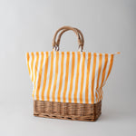 A cheerful companion for warm-weather outings. This insulated picnic bag features a lively yellow stripe and a structured willow base, combining practicality with a touch of vintage picnic charm.