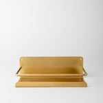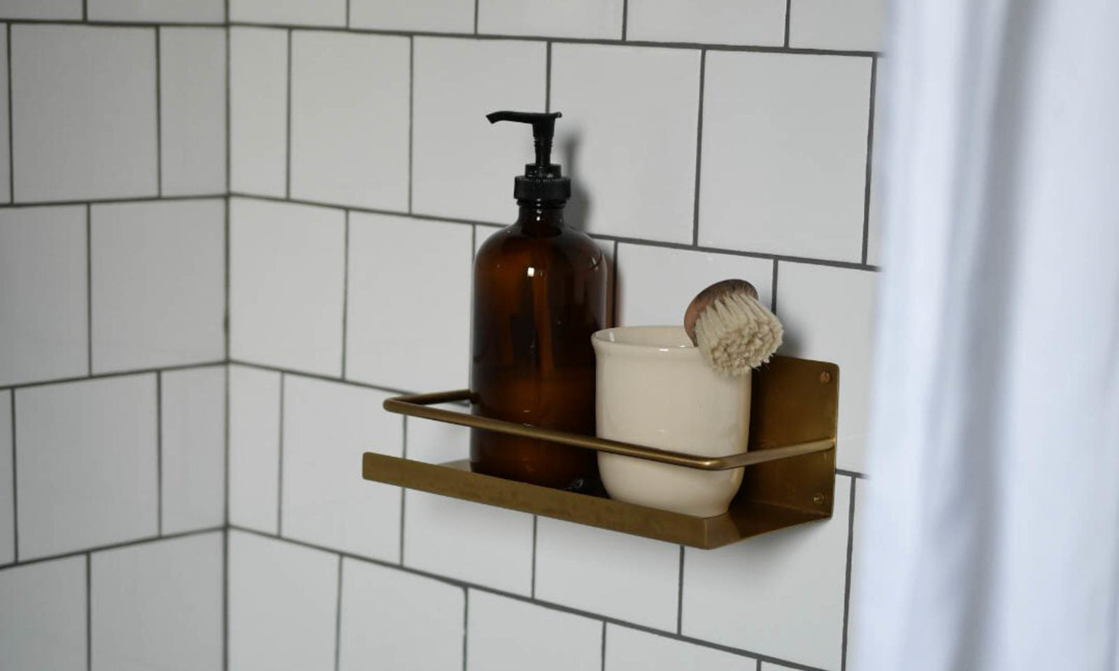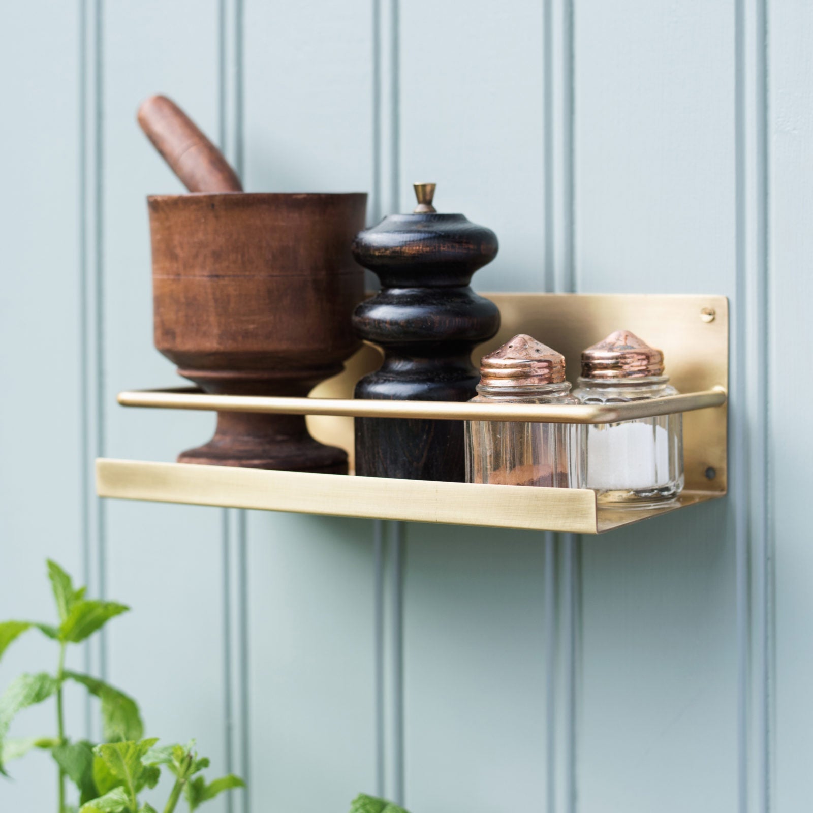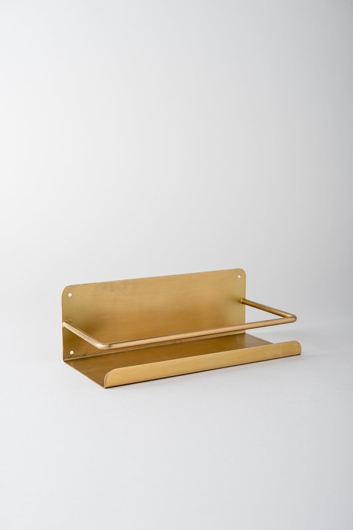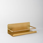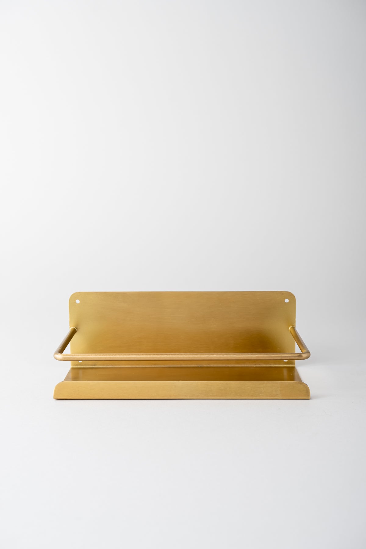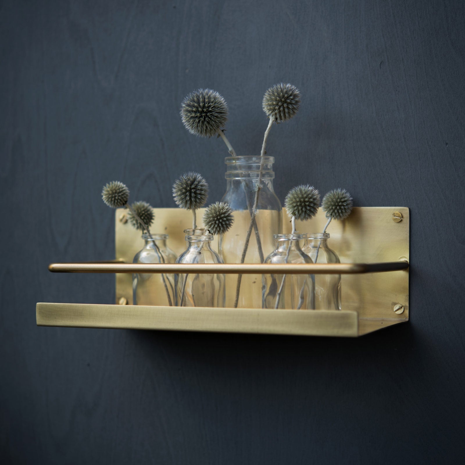 Versatile, hand-made shelf of warm, antiqued brass. Install this is any room of your home where you'd like a compact, organizing feature.