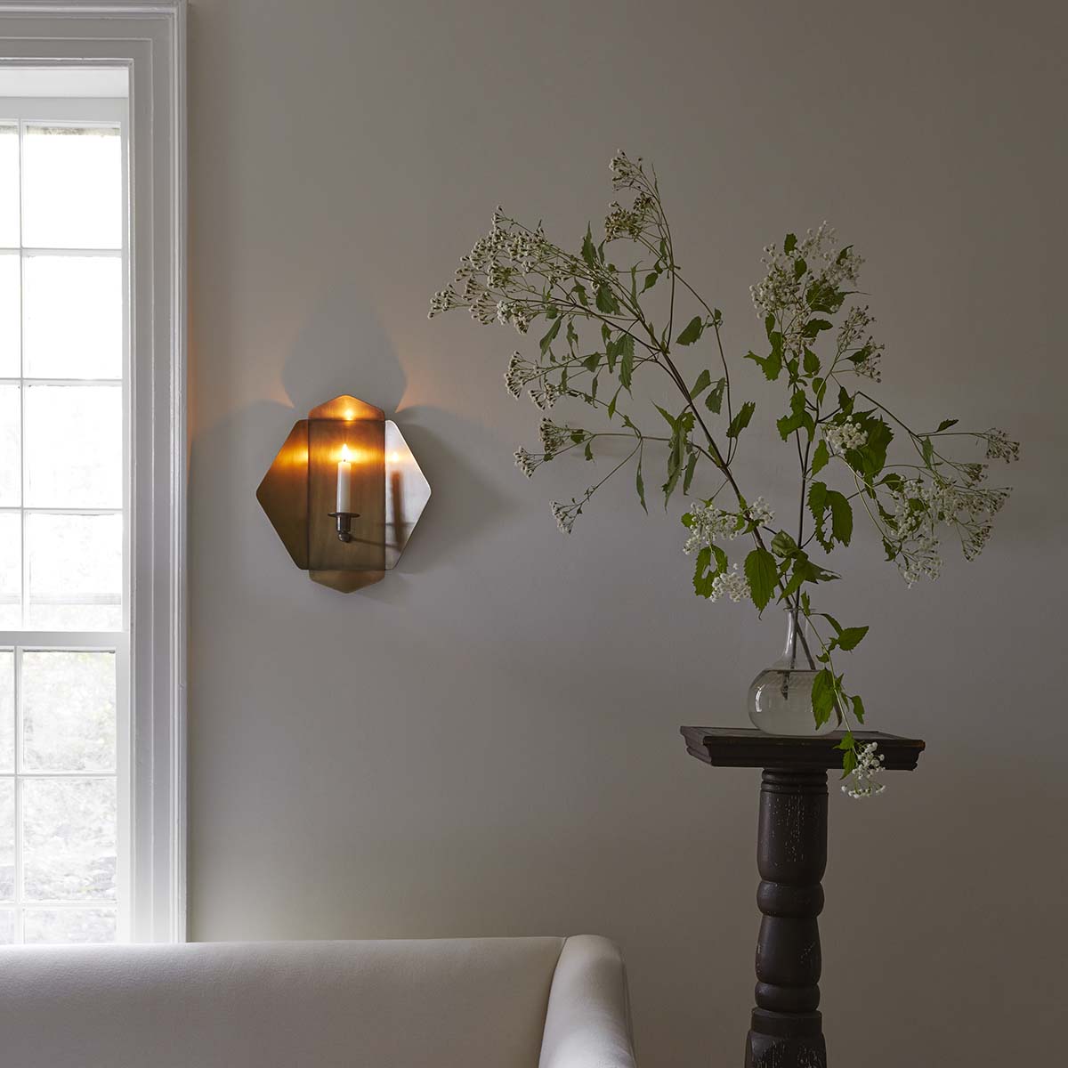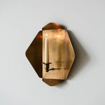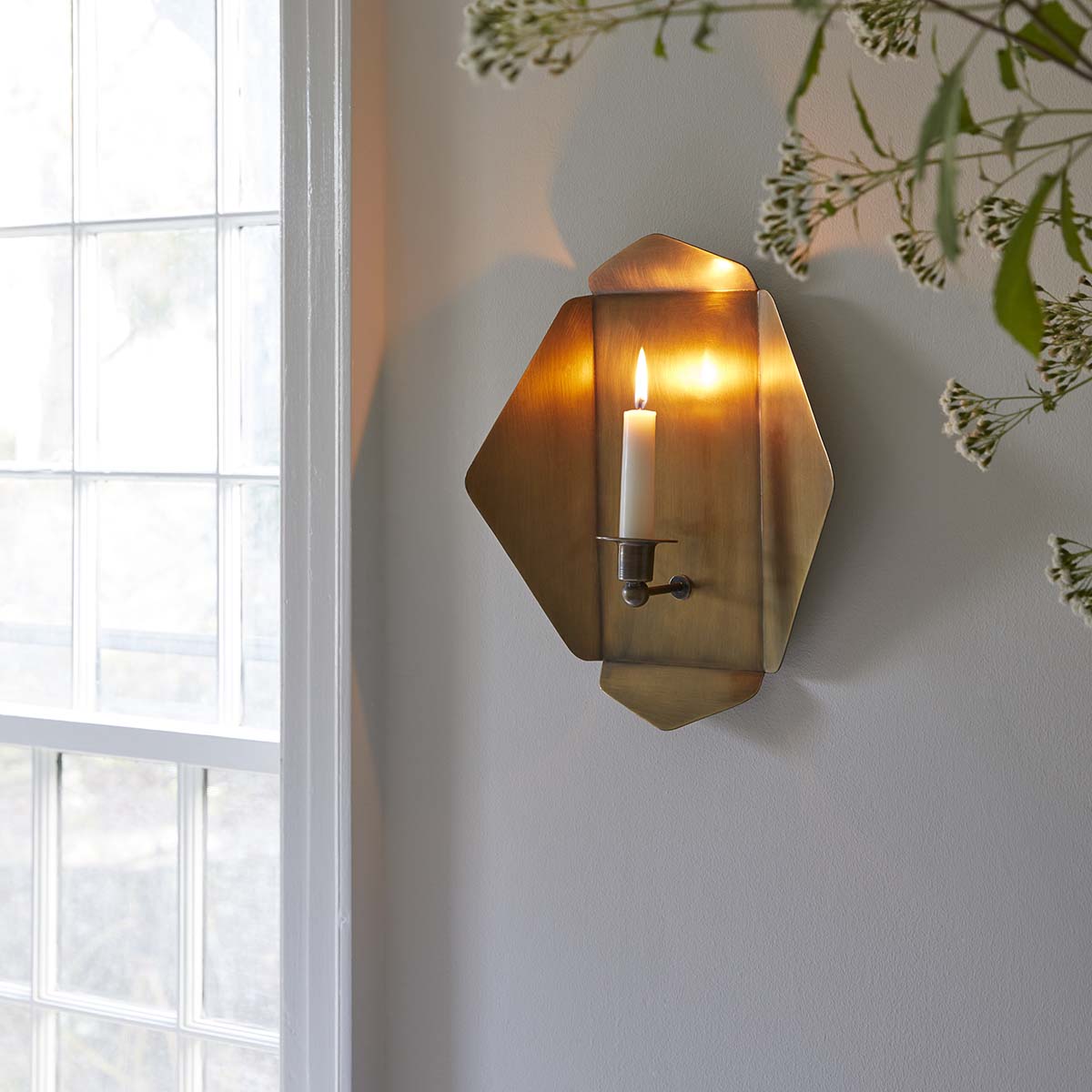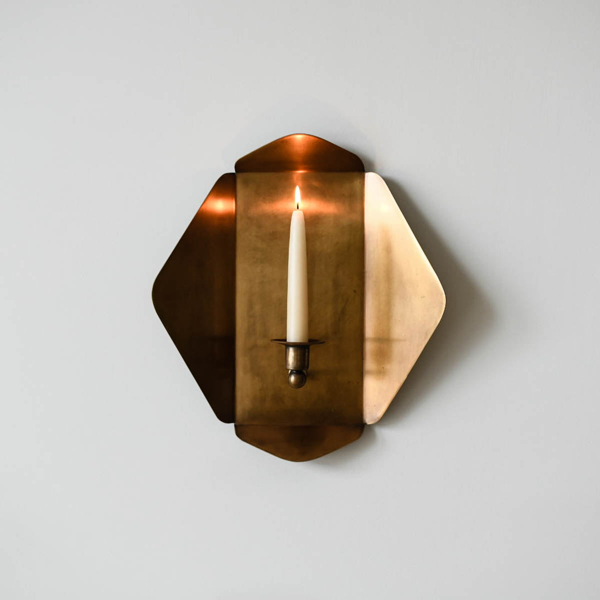 The four simple folds of this wall-mounted candle sconce envelope the flame in a reflective golden glow, casting off shadows like the petals of a quatrefoil. Constructed from brass-plated steel sheeting, it features a secure double- mount backing that sets it slightly off the wall. Beautiful solo, and stunning as a pair.