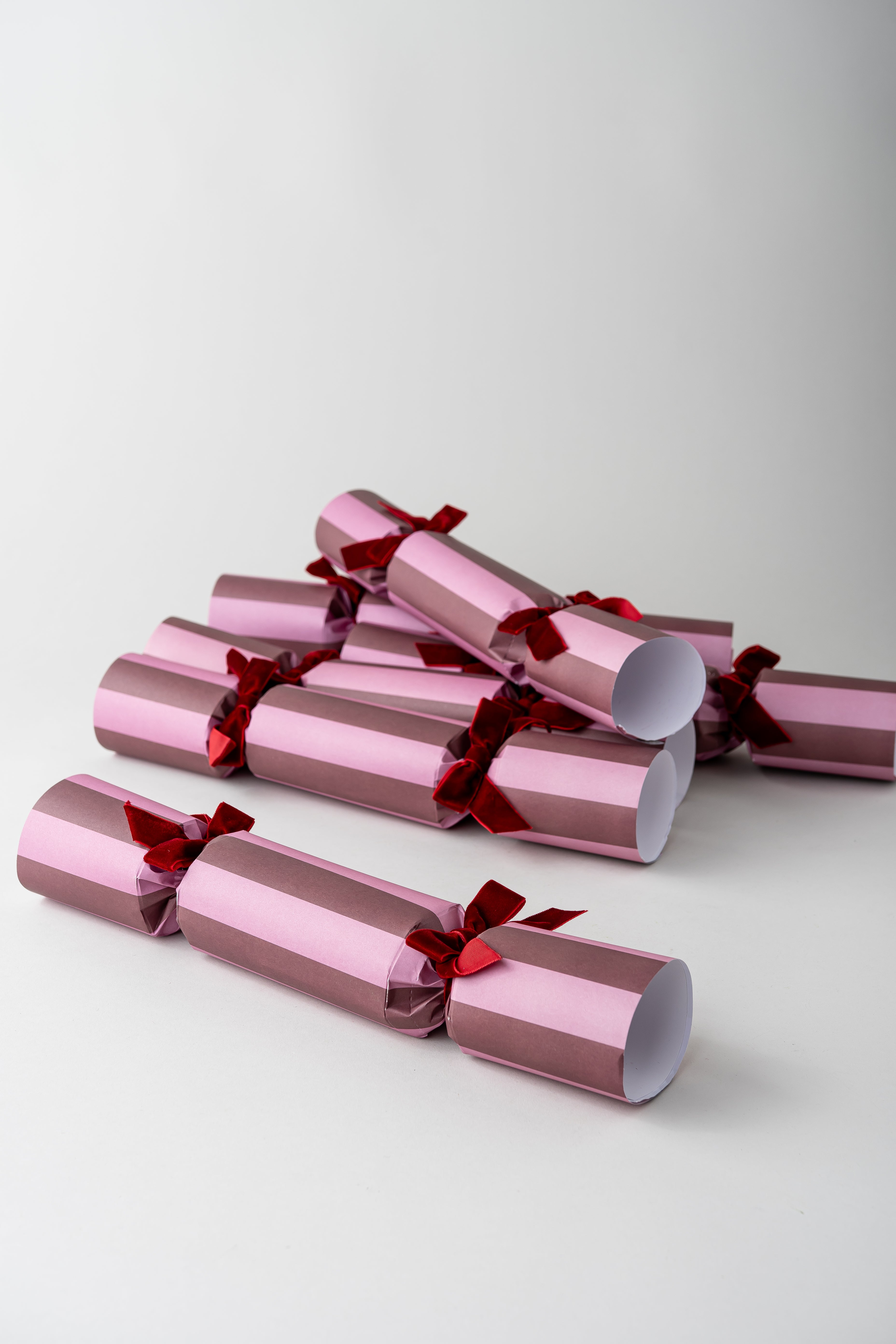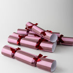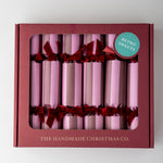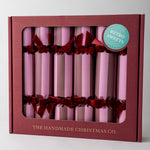 A set of six handmade Christmas crackers as delightful to behold as the ritual itself. Featuring a bold two-tone design in rich cranberry red and blush pink, finished with deep burgundy velvet ribbons for a touch of elegance.
