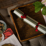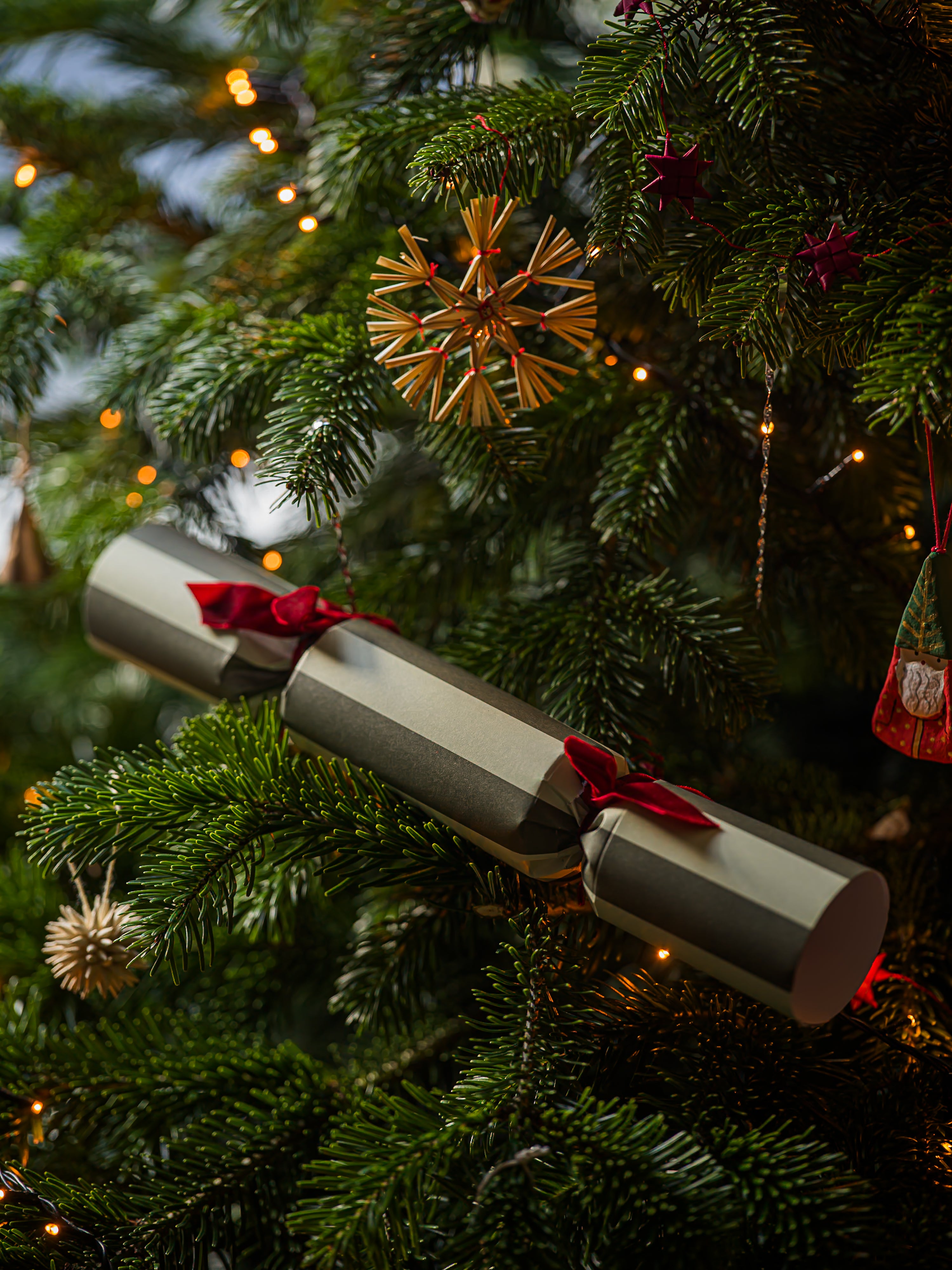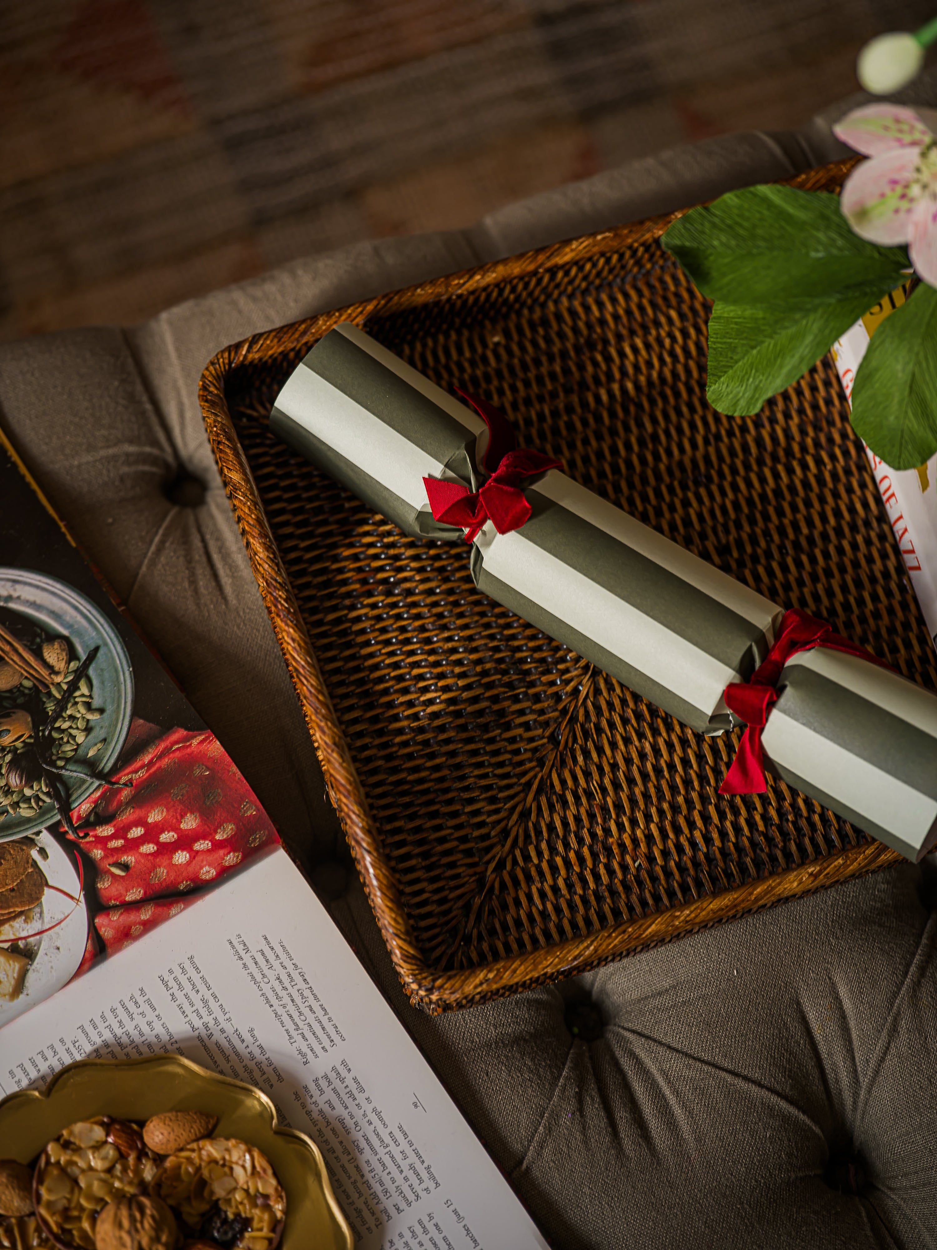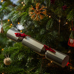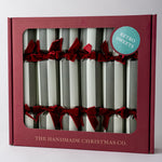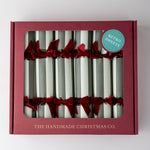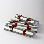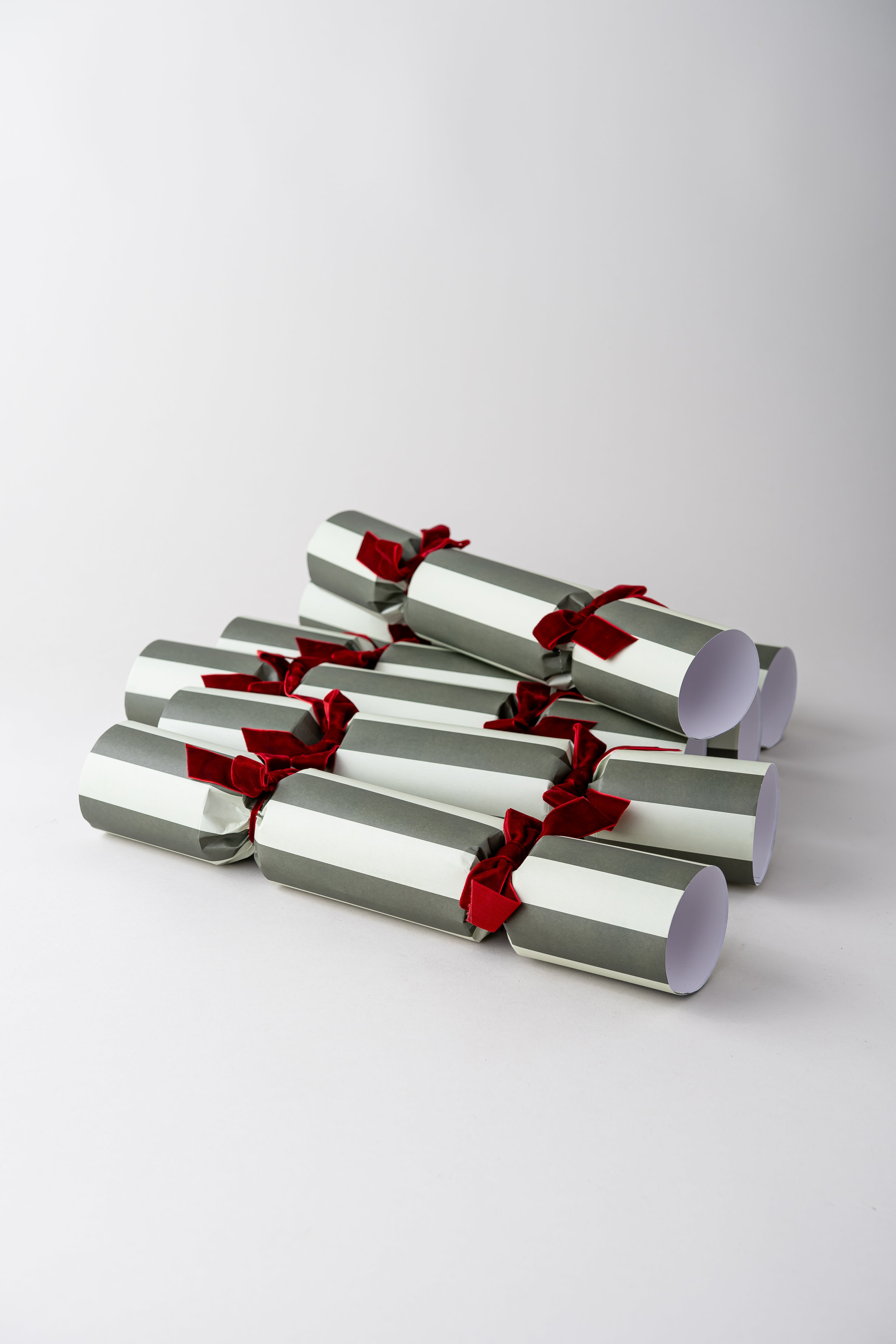 A set of six handmade Christmas crackers as delightful to behold as the ritual itself. Featuring a bold two-tone design in rich and soft green, finished with deep burgundy velvet ribbons for a touch of contrast and elegance.