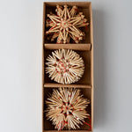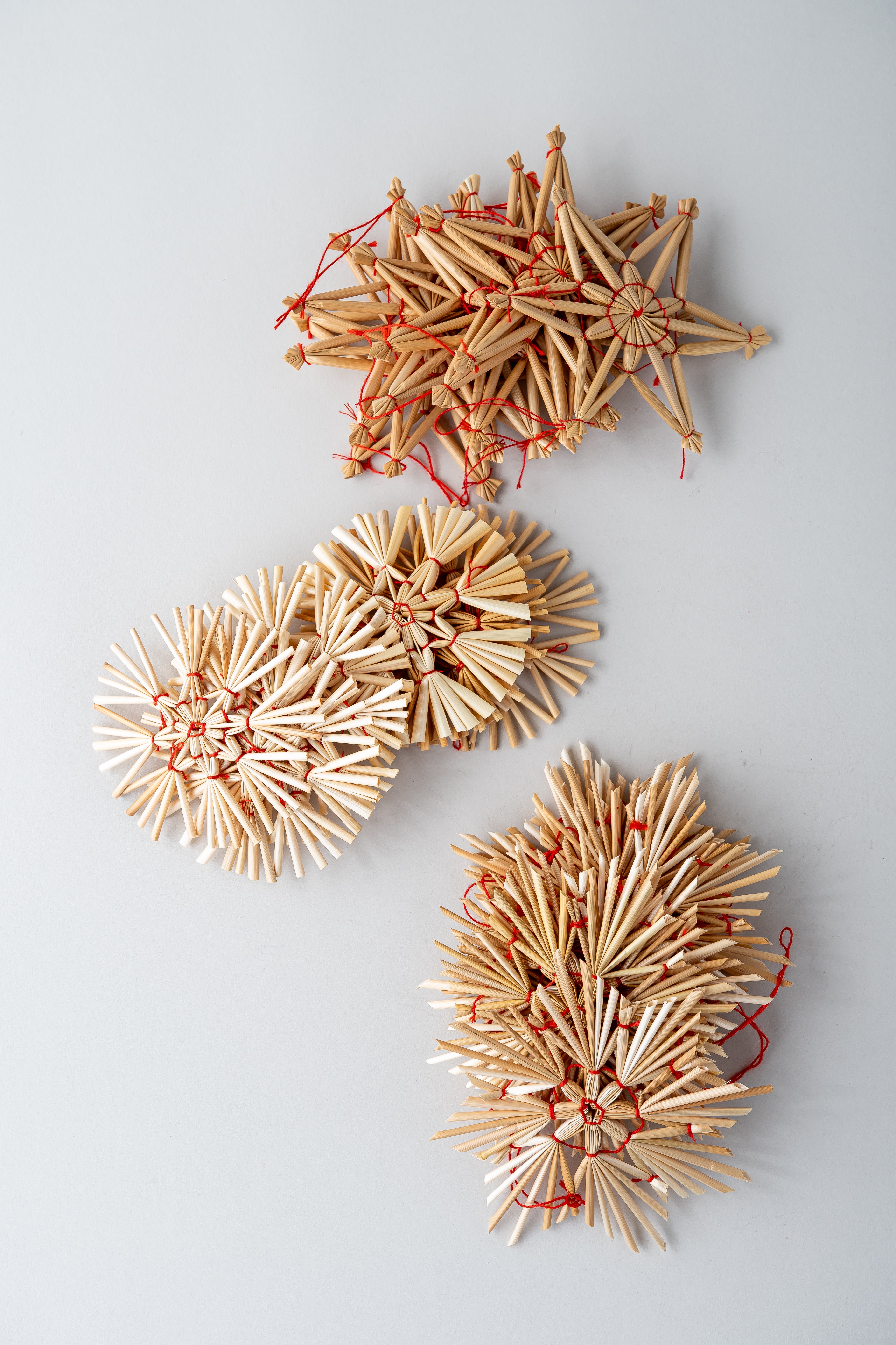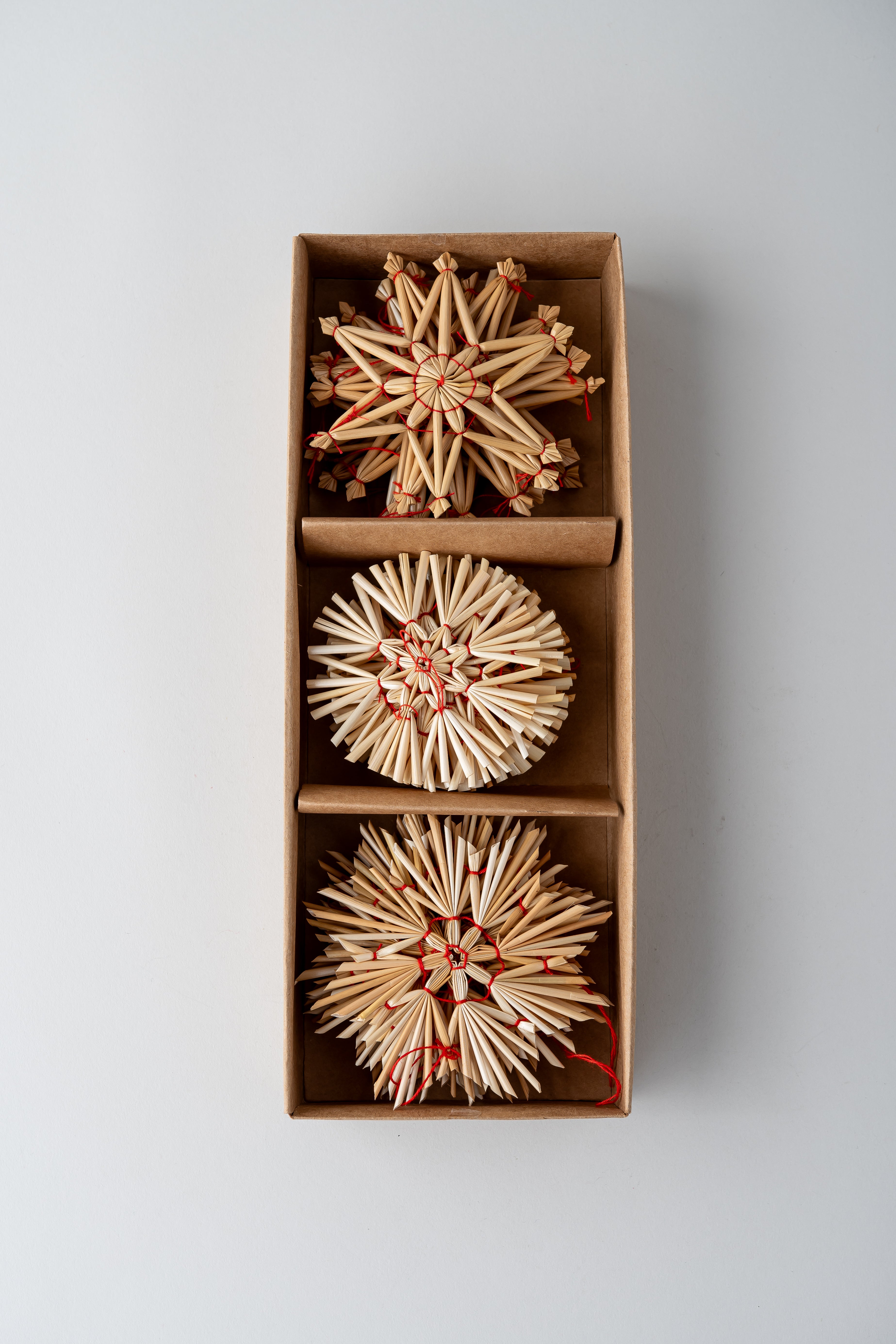 A classic nod to Nordic tradition, these ornaments are carefully crafted from natural straw. Each set includes three different star designs, strung and ready to hang for a warm, timeless holiday touch. With 24 pieces in each box (eight of each design), they’re perfect for trimming the tree, tying onto gifts, or weaving into garlands.