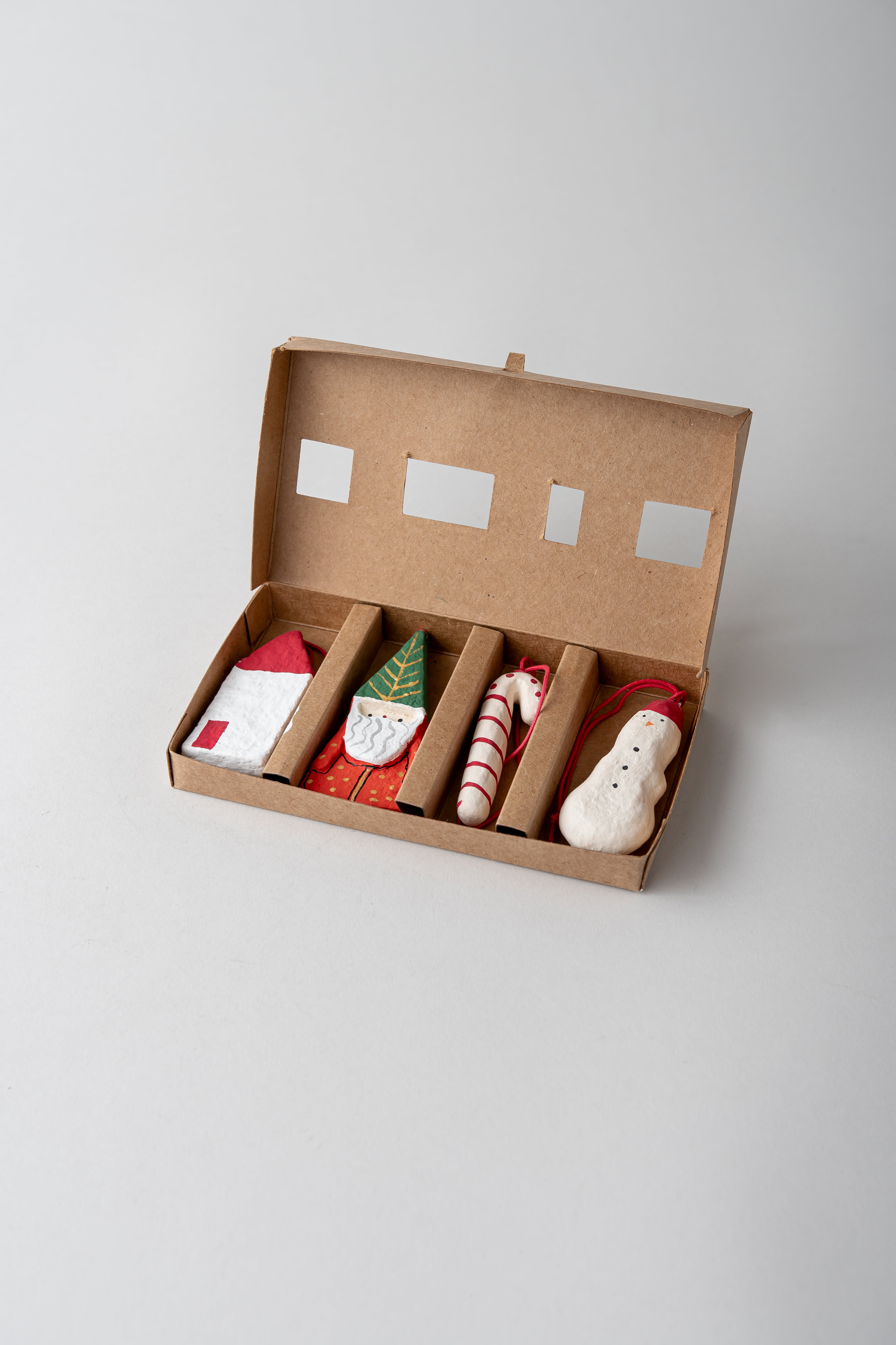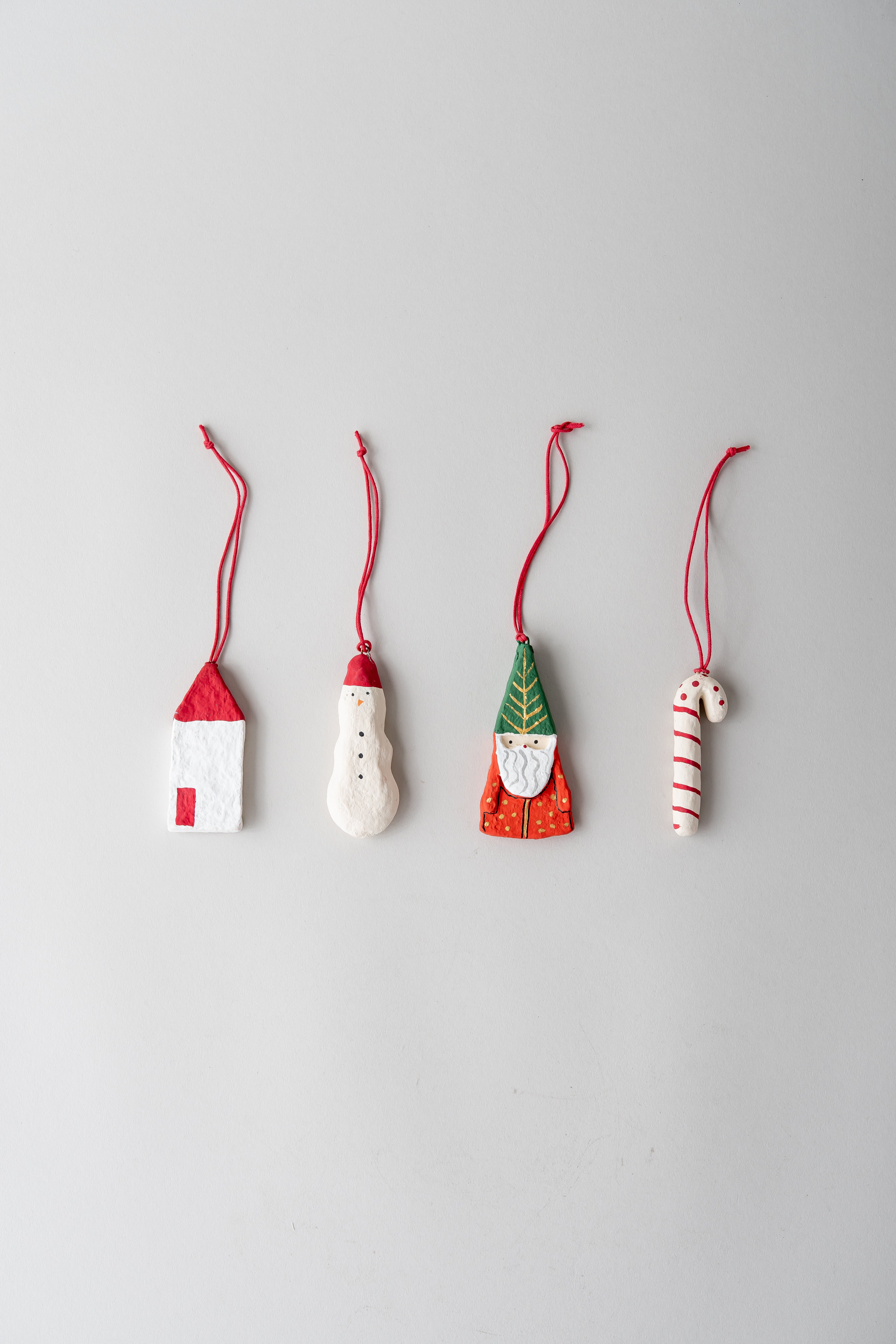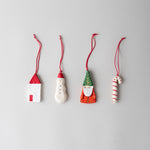 Carefully shaped, layered, and painted by artisans in Jaipur, this set of four ornaments captures the charm of holiday folklore. Each box includes a snowman, Santa Claus, candy cane, and house motif - festive details to bring cheer to the tree.
