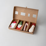 Sold as a set of four (house, snowman, Santa Claus, candy cane), boxed.