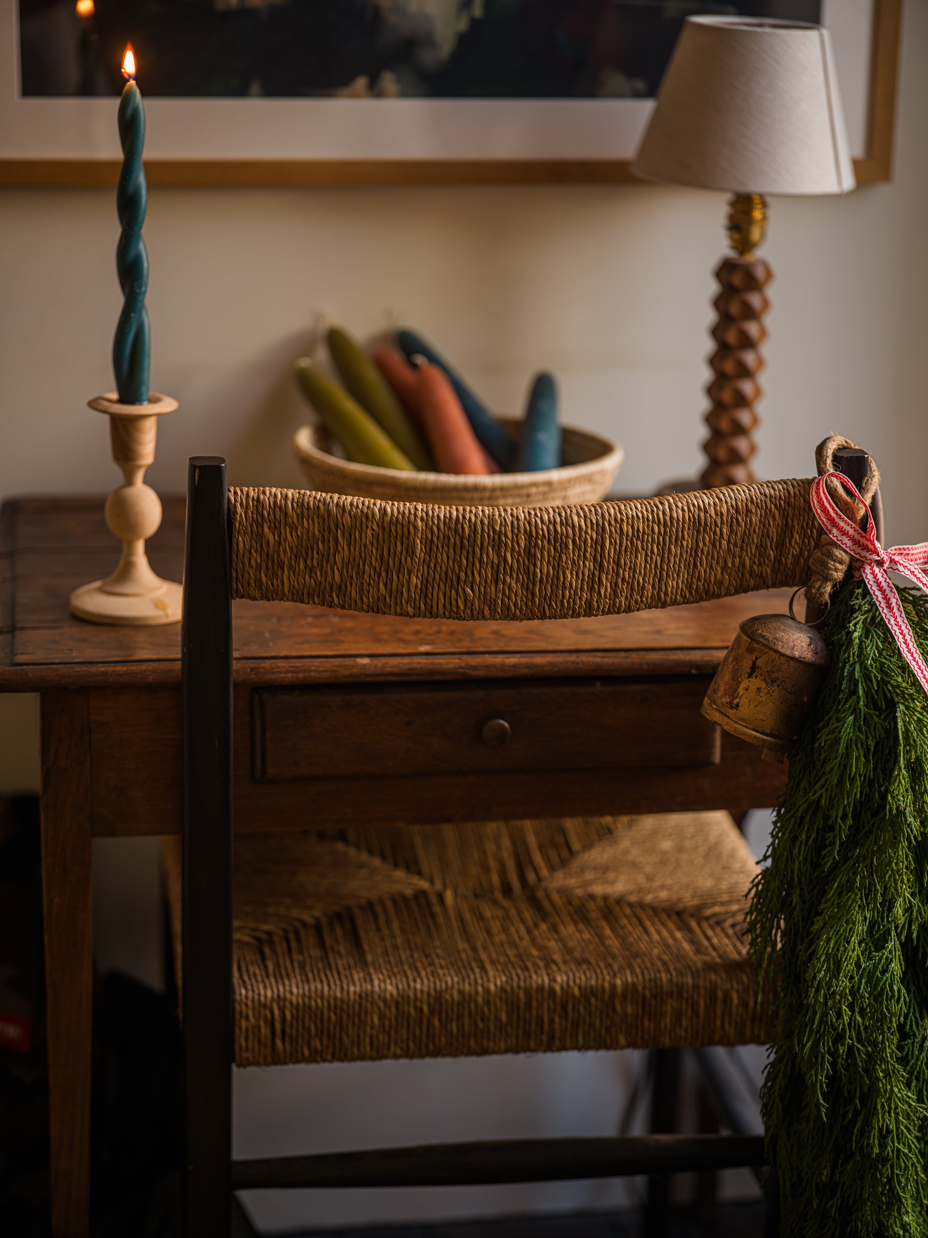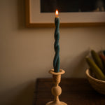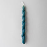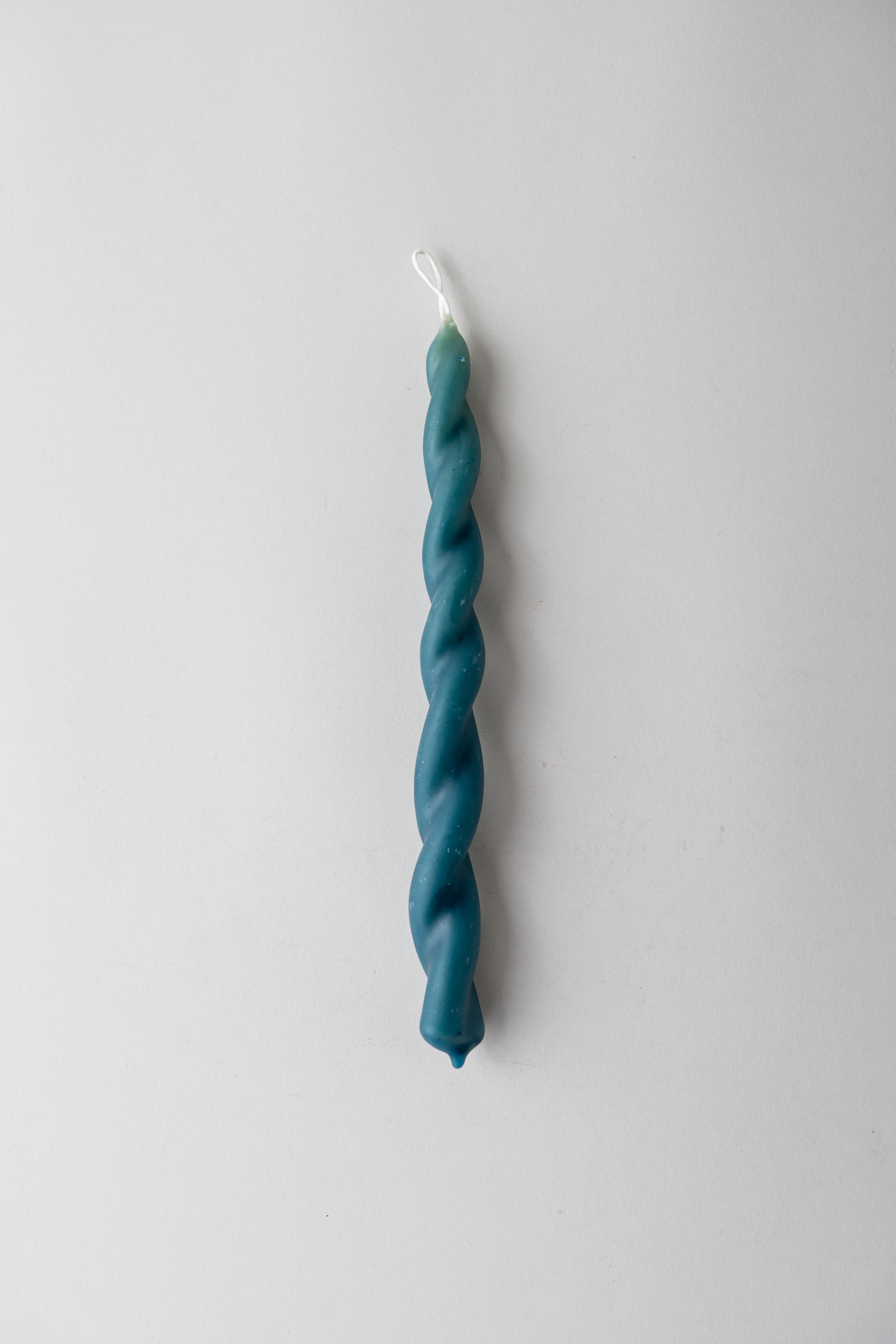 An elegant, hand-twisted taper candle made of the finest beeswax and dyed with natural algae pigment. Designed to fit most standard taper candle holders.