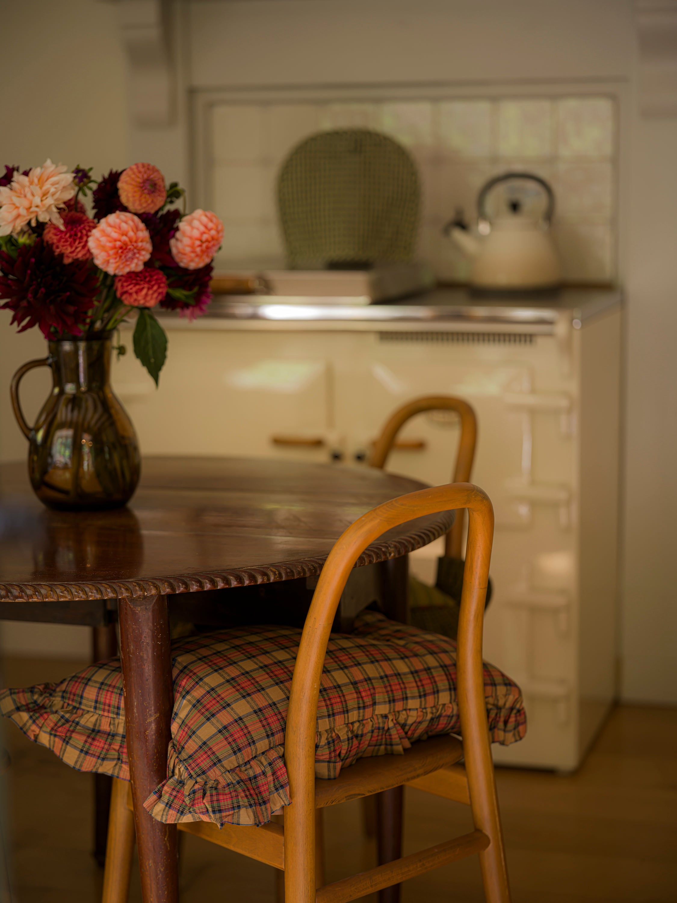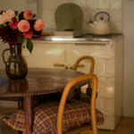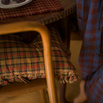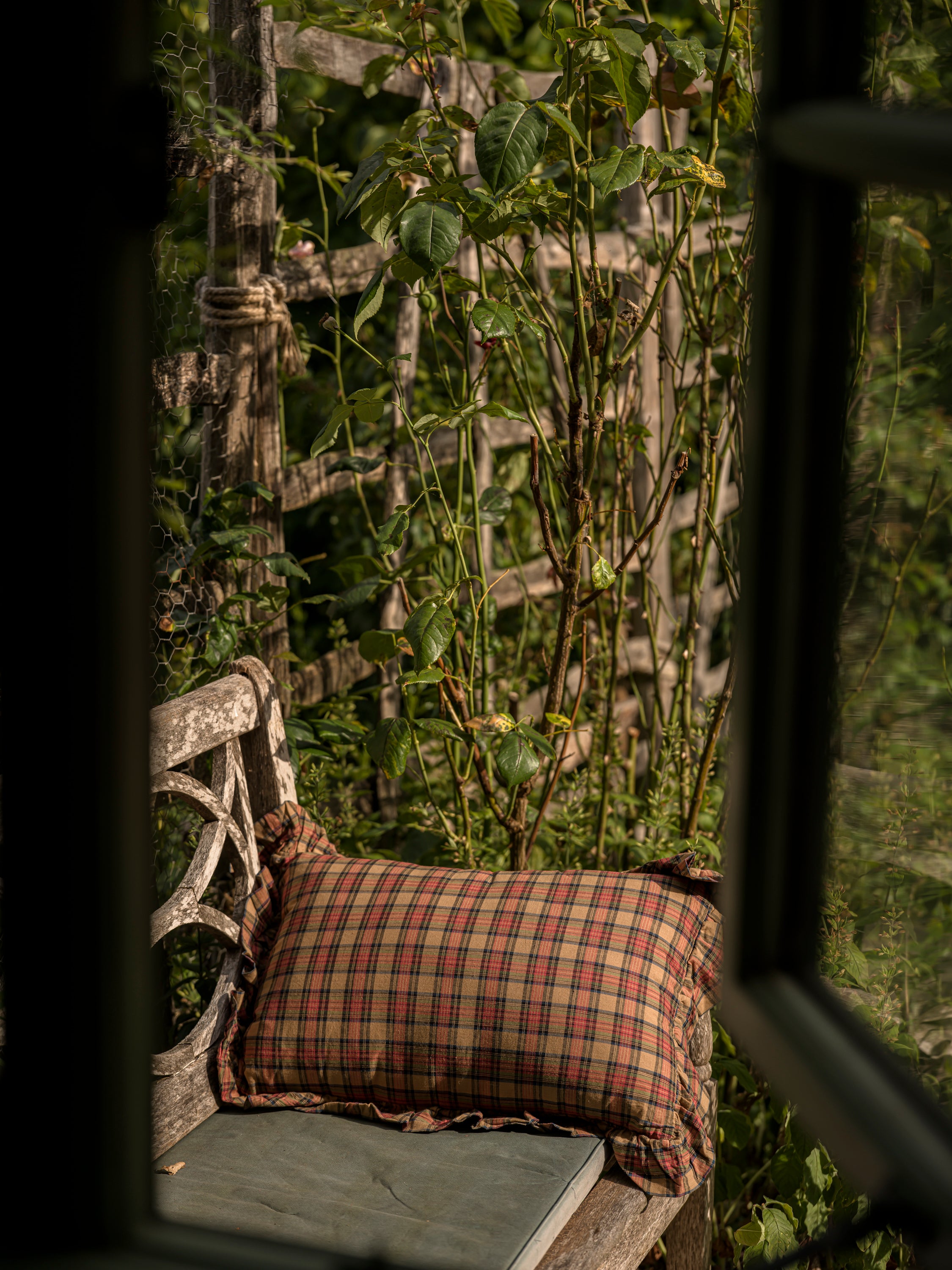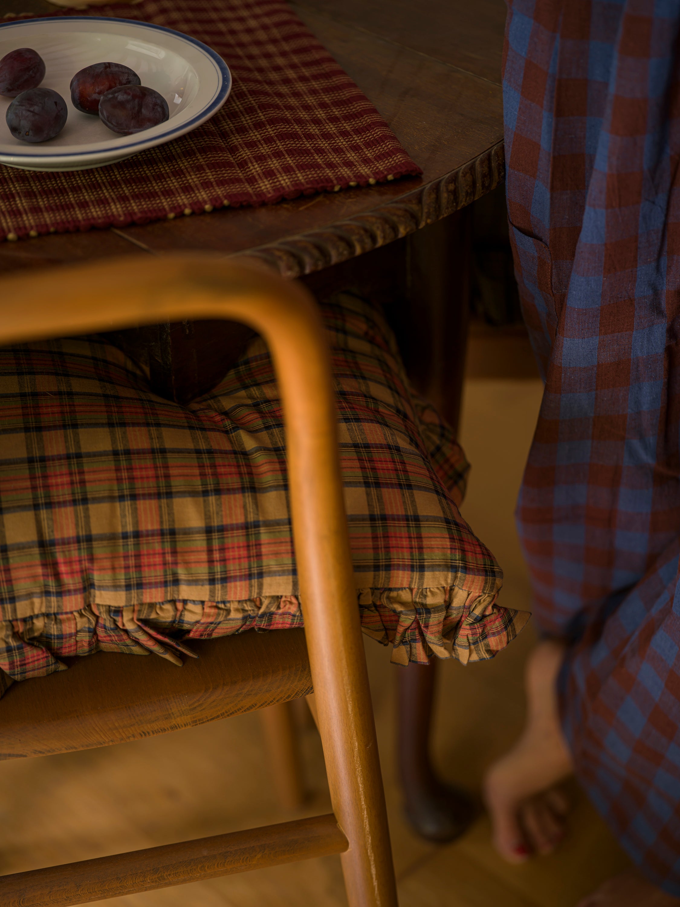 Wide ruffles and muted tones inspired by woodland wildflowers give this cushion cover a quietly elegant charm. Crafted in a soft natural tan plaid with subtle accents of red and blue, it balances a tailored pattern with a romantic ruffled edge.