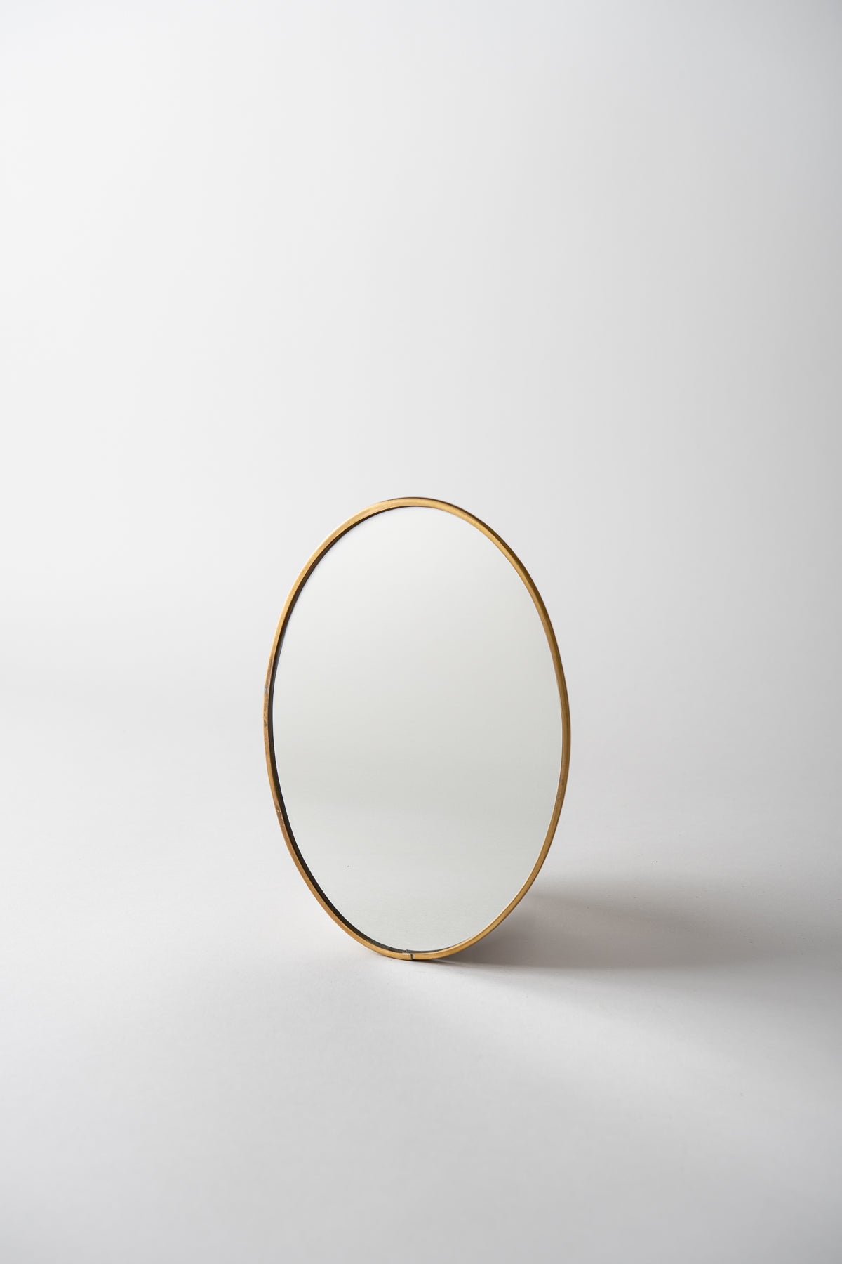 A small, antique-finished brass frame mirror. Featuring a hook on the back for wall hanging, or prop it up on a desk or shelf.