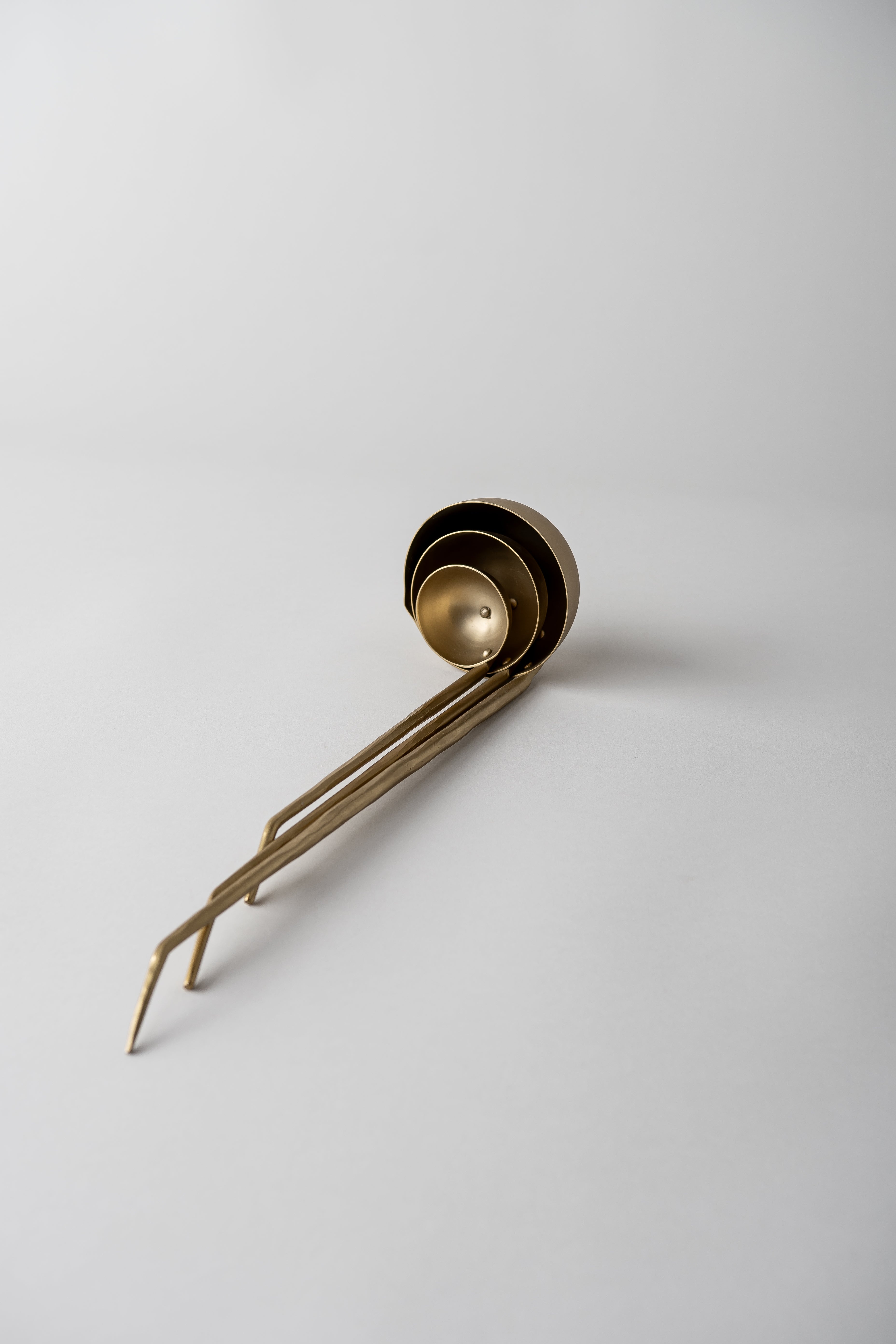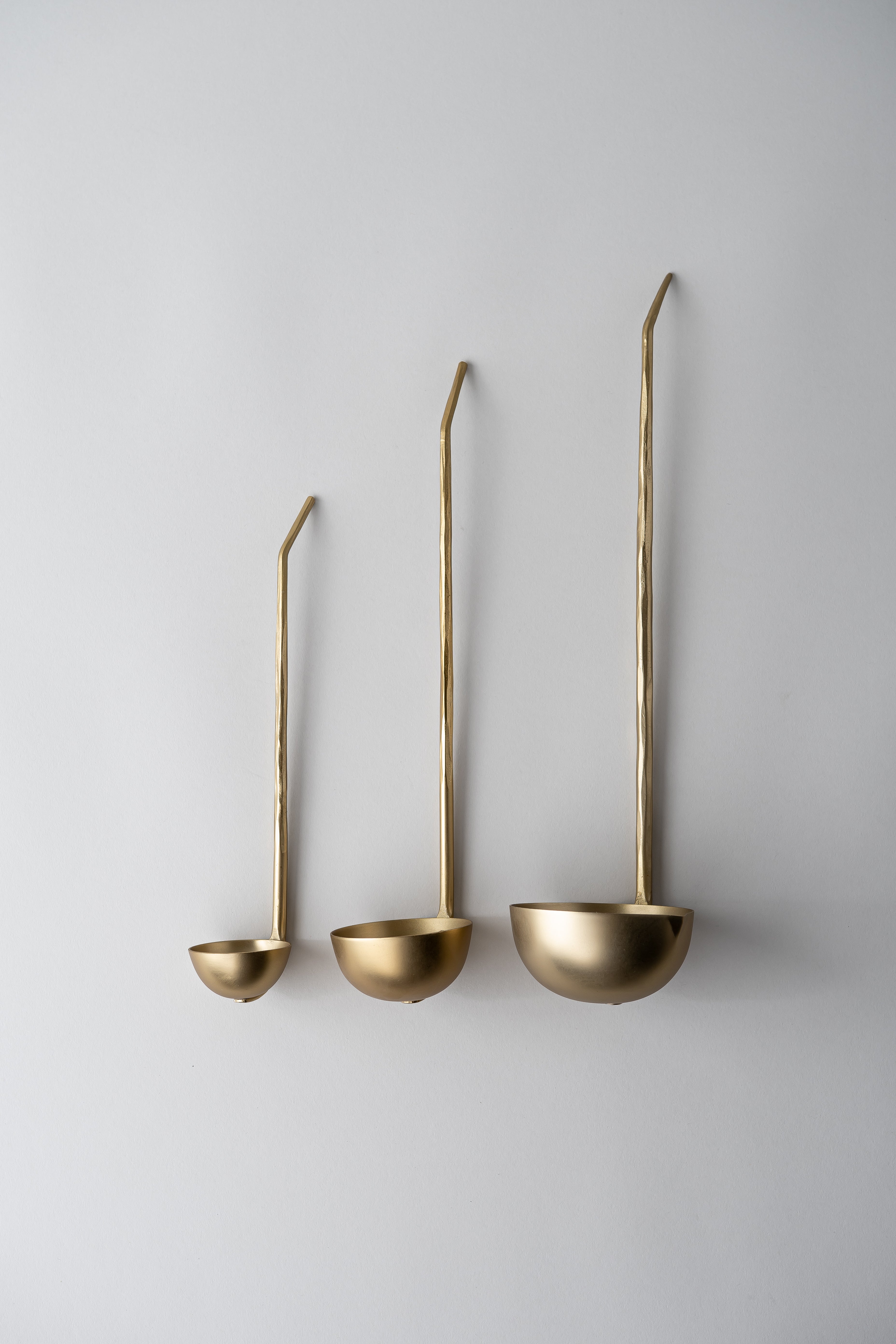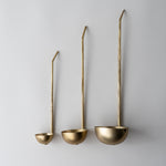 All three sizes sport roomy, half-round cups affixed with rivets to slender, slightly tapered hammered handles. Hand-forged from stainless steel and coated with a food-safe brass lacquer. Each have a lovely hammered texture and subtle bend, the largest ladle features a small pouring spout.