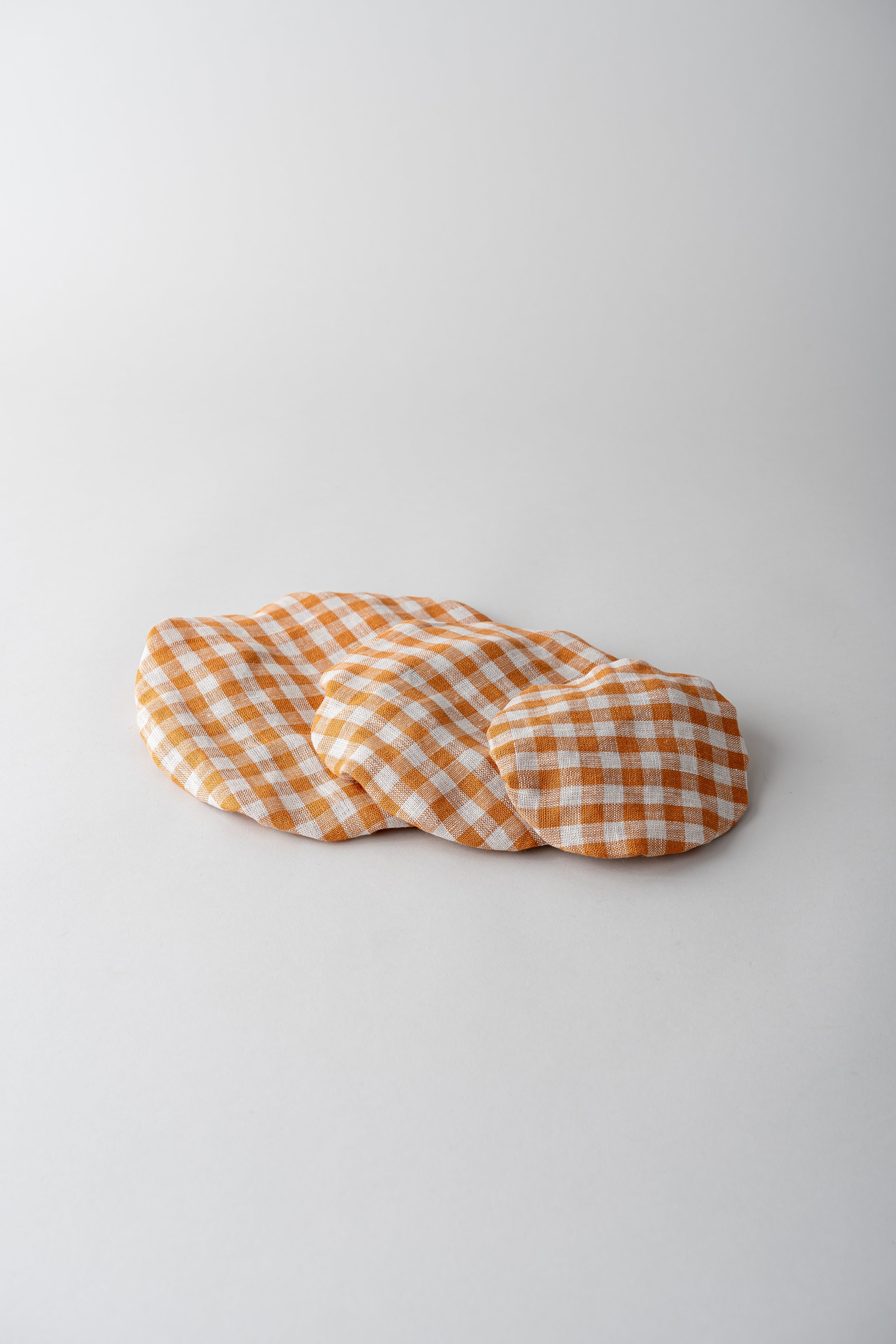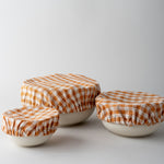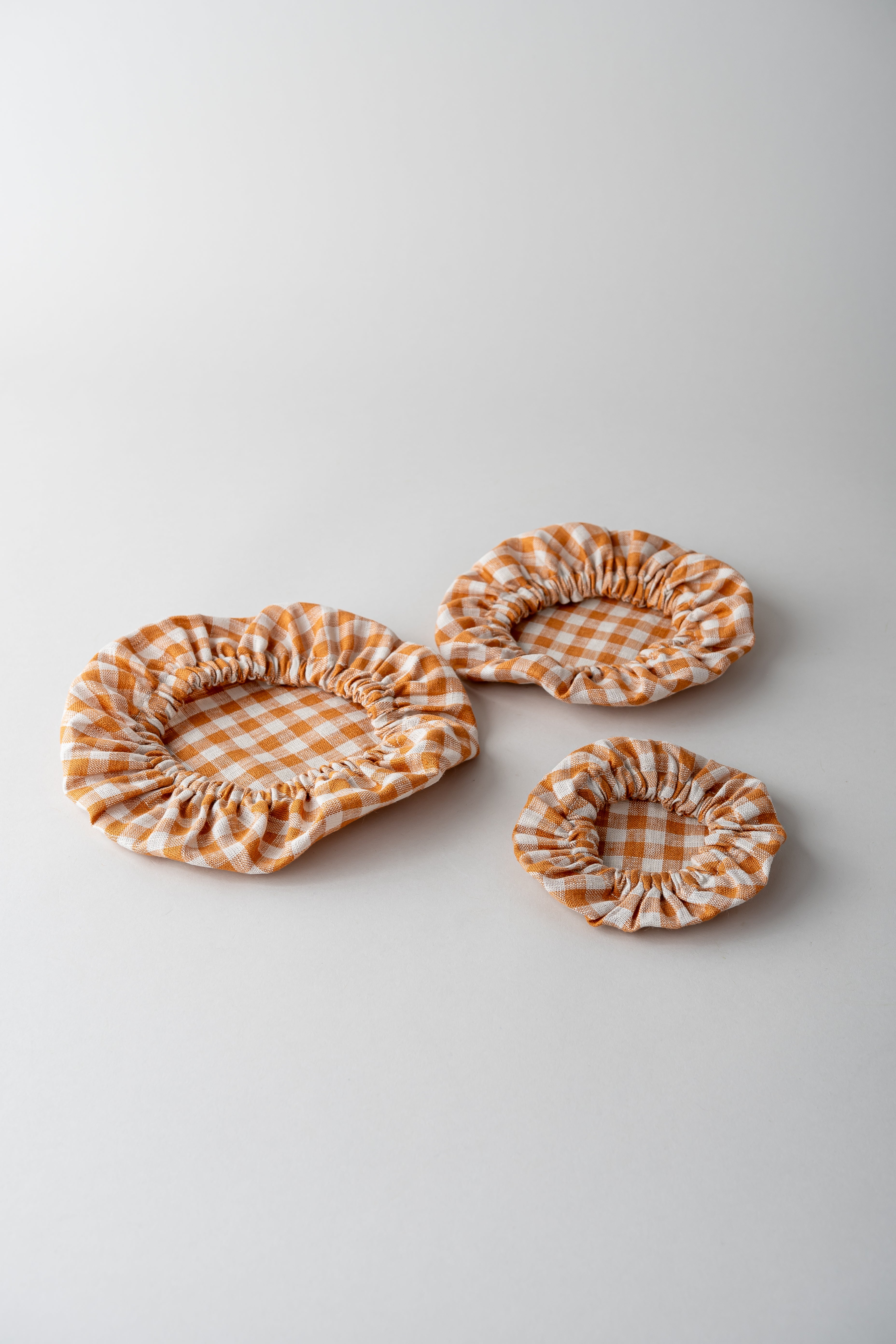 A set of three bowl covers made with linen fabric and elasticized around the edge to fit over your bowls. An eco-friendly and sustainable alternative to plastic wrap, these will be at home in any kitchen.