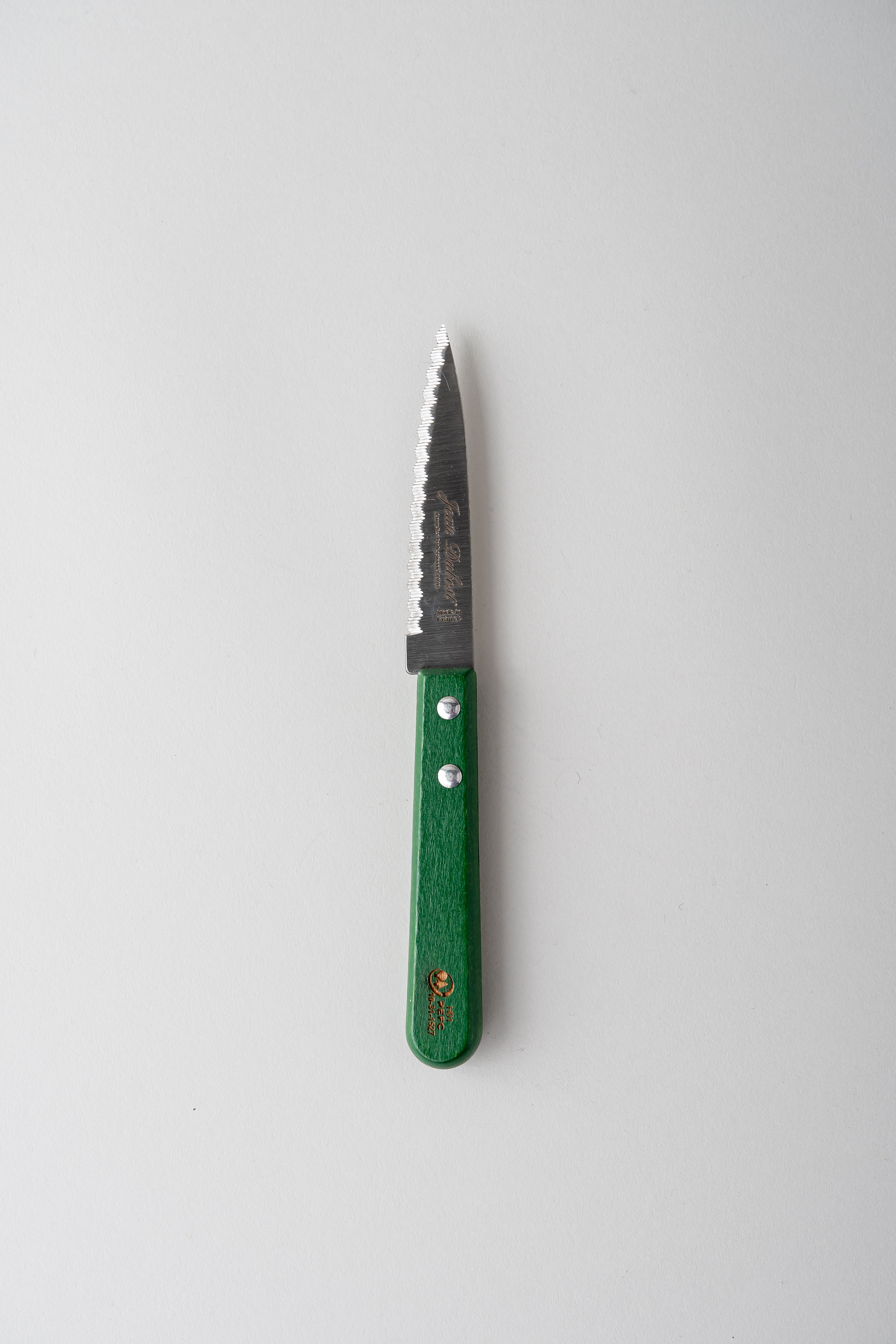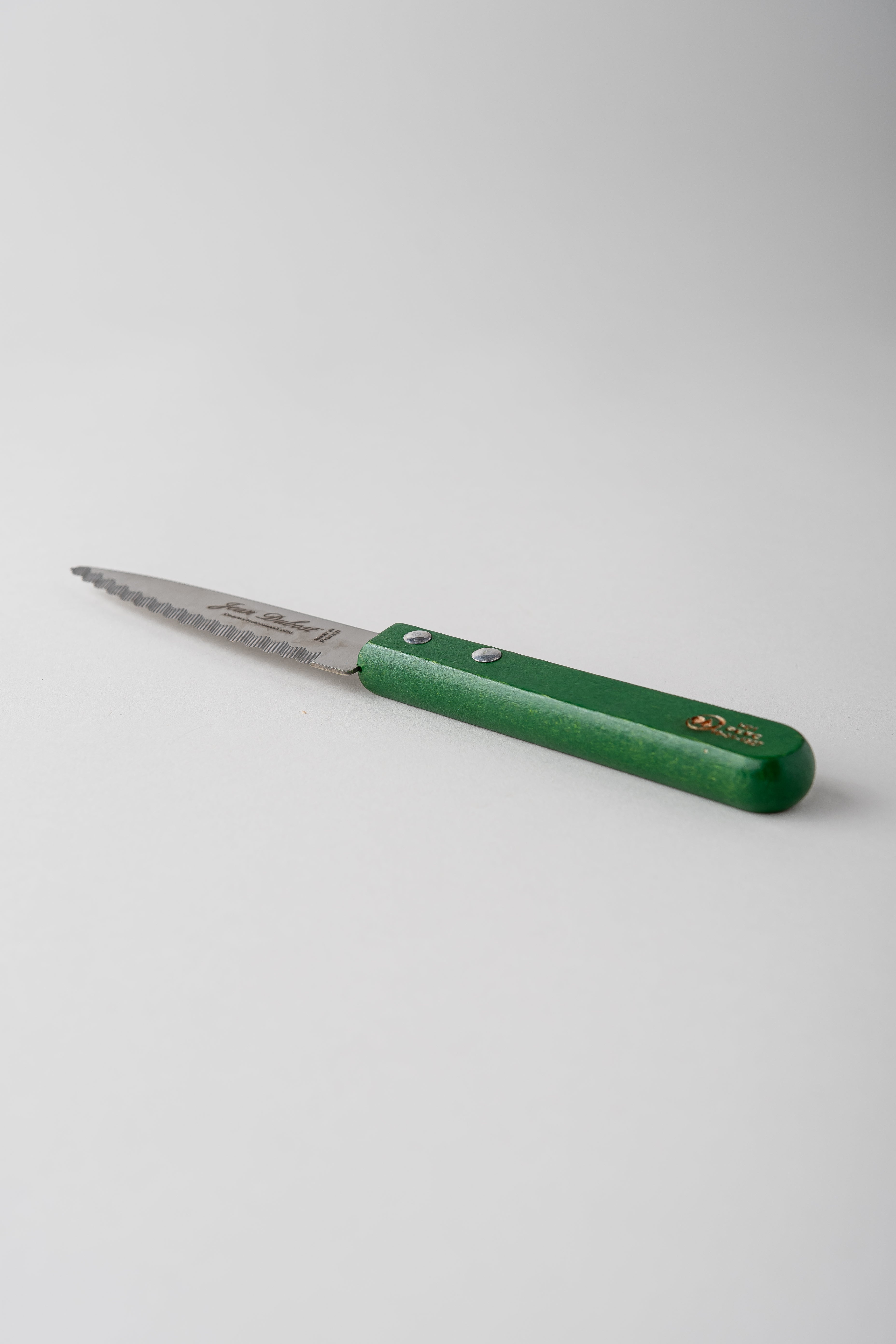 A small but mighty kitchen essential, expertly designed by Jean Dubost. This paring knife features a serrated stainless steel blade and a smooth beechwood handle, finished in a rich green tone. Lightweight, balanced, and designed for precision - perfect for tasks that require a bit of precision, like slicing through soft fruits, vegetables with slippery skins, or delicate pastries and baked goods.
