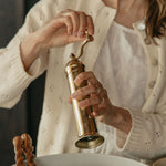 The brass salt mill features a strong, food-safe plastic mechanism with an intricate cut system design to grind the salt rather than smash it, maximizing its flavour and aroma. Common salt mills only smash the salt which severely limits the flavour release.