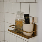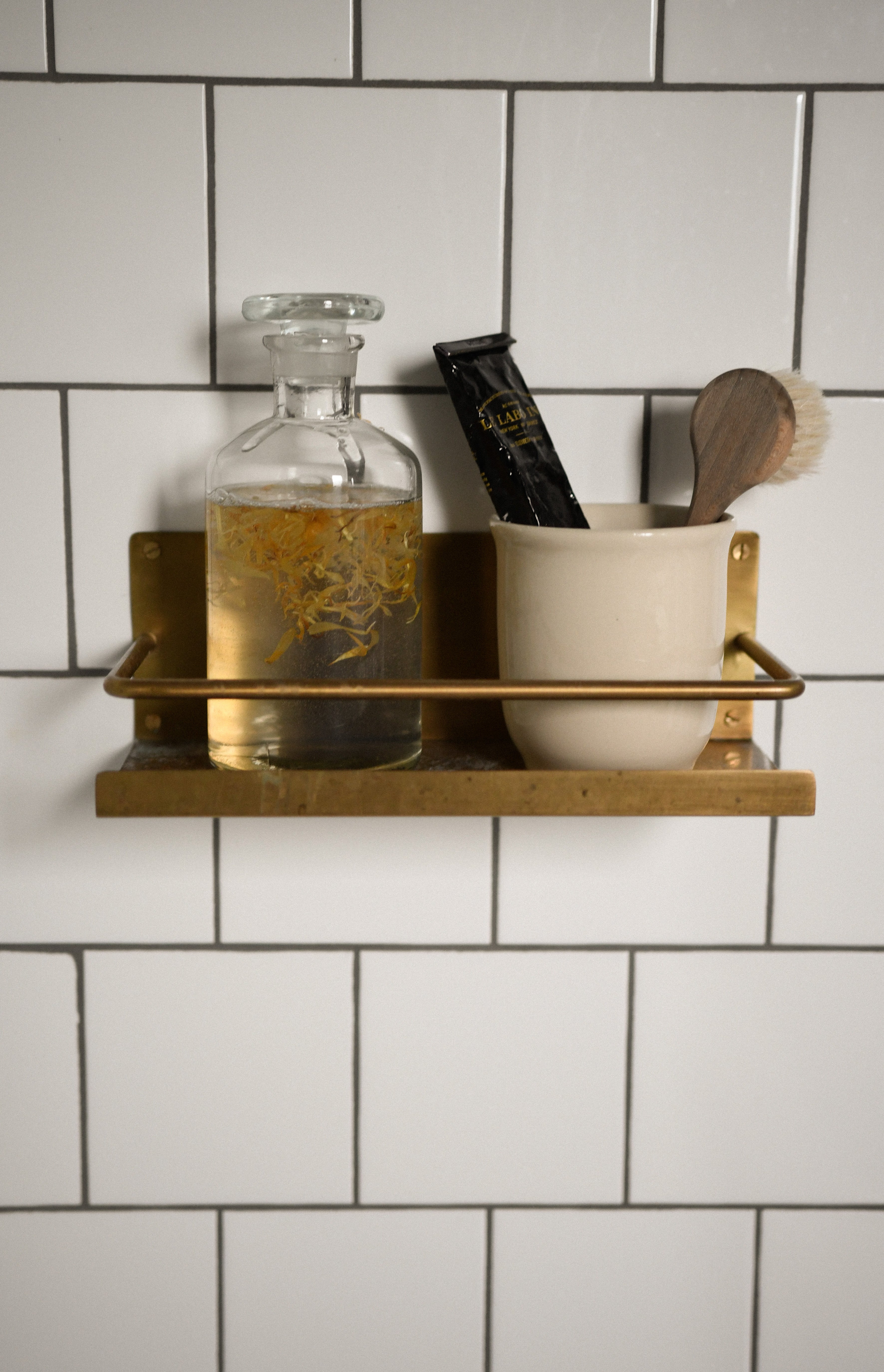 Versatile, hand-made shelf of warm, antiqued brass. Install this is any room of your home where you'd like a compact, organizing feature.